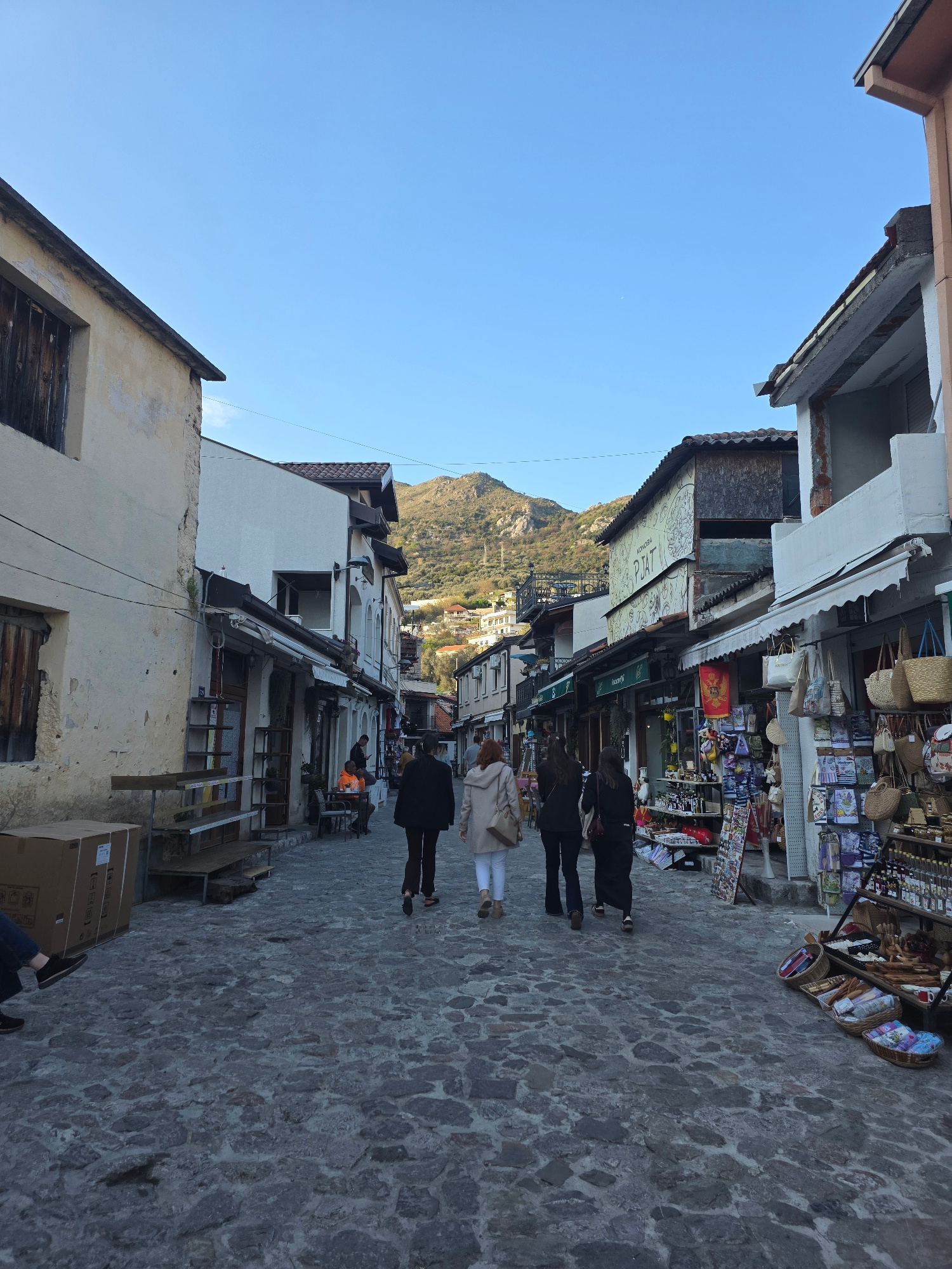 The image captures a view of a narrow street in Stari Bar, Montenegro. The street is paved with cobblestones and lined with buildings of varying heights and architectural styles, with some appearing q…read more