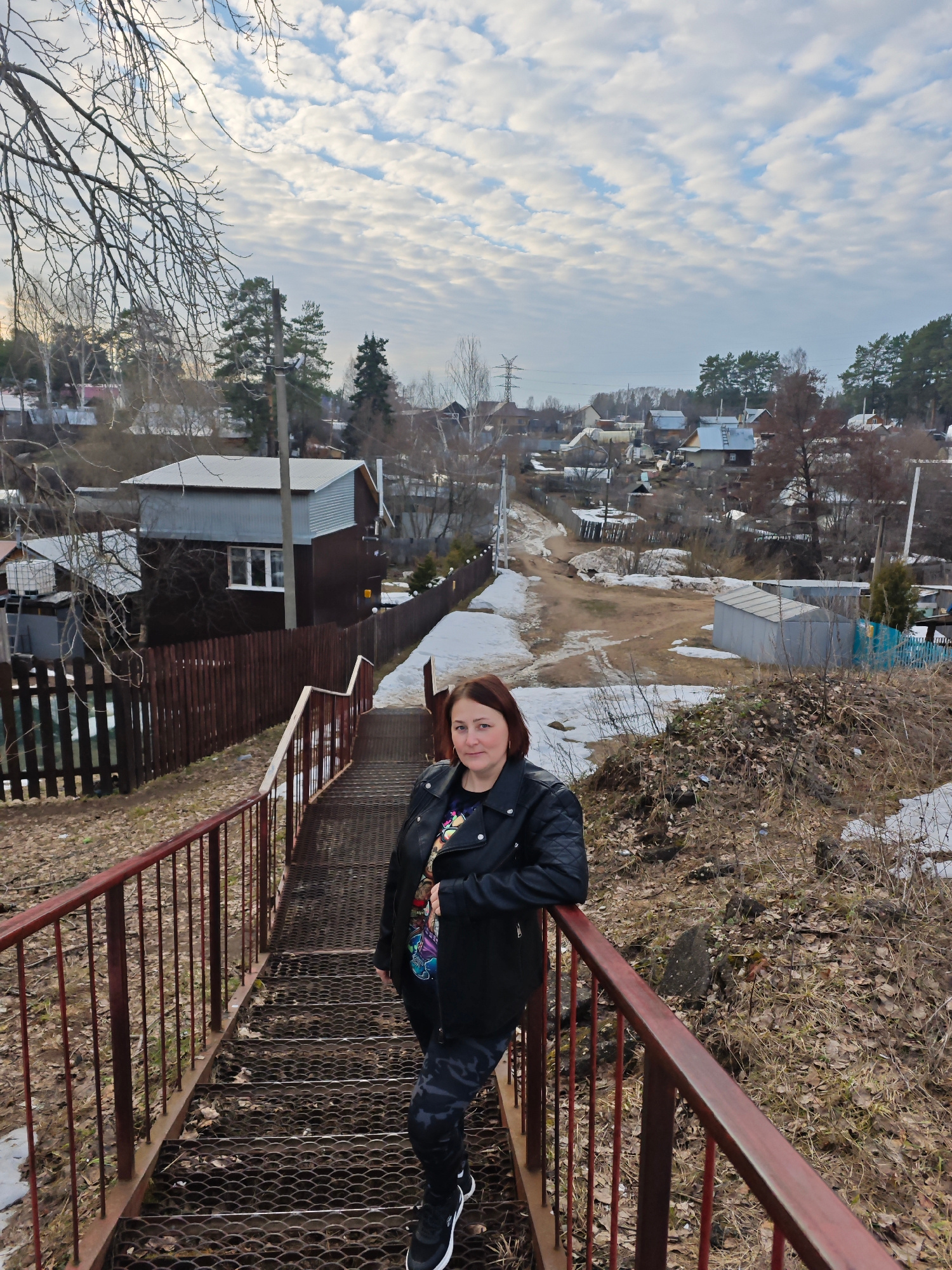 A woman stands on metal stairs with red railings in Chaikovsky, Russia. The stairs lead down from a residential area with small houses and trees, with patches of snow visible on the ground. The sky is…read more