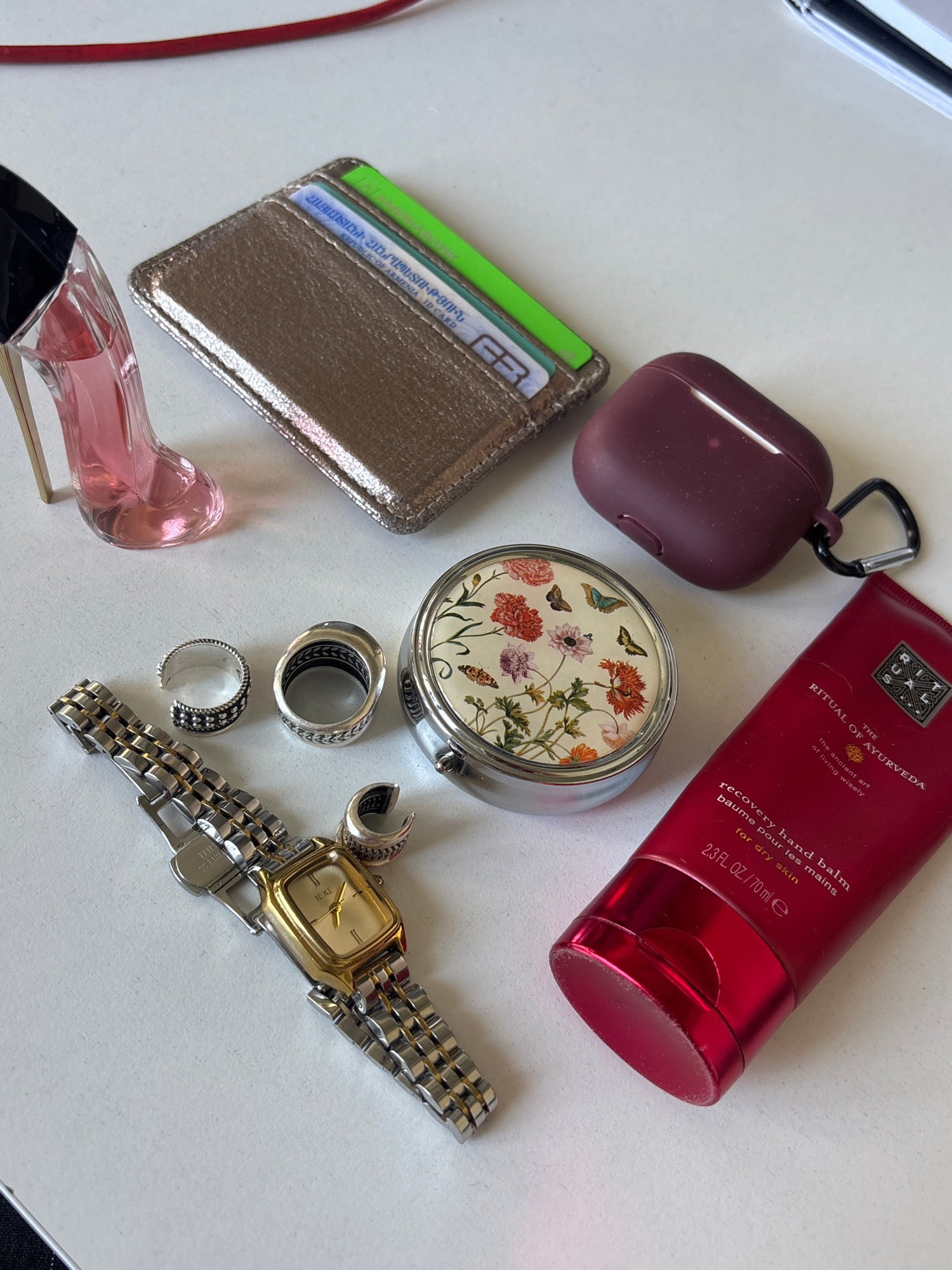 The image shows a collection of personal items arranged on a white surface. These items include: * A tube of red "Ritual of Ayurveda" recovery hand balm. * A round, decorative compact mirror ador…read more
