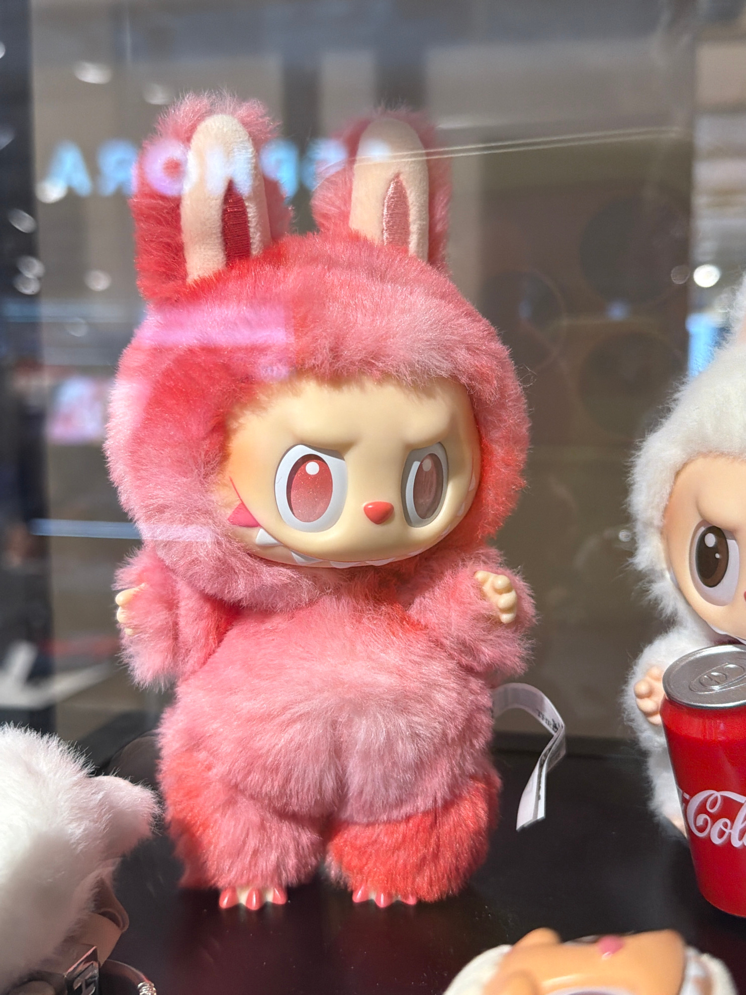 The image shows a pink, furry toy with large eyes and rabbit ears lying in a glass display case. The toy has a human-like face with a pink heart-shaped nose and a small, white tooth visible in its ope…read more