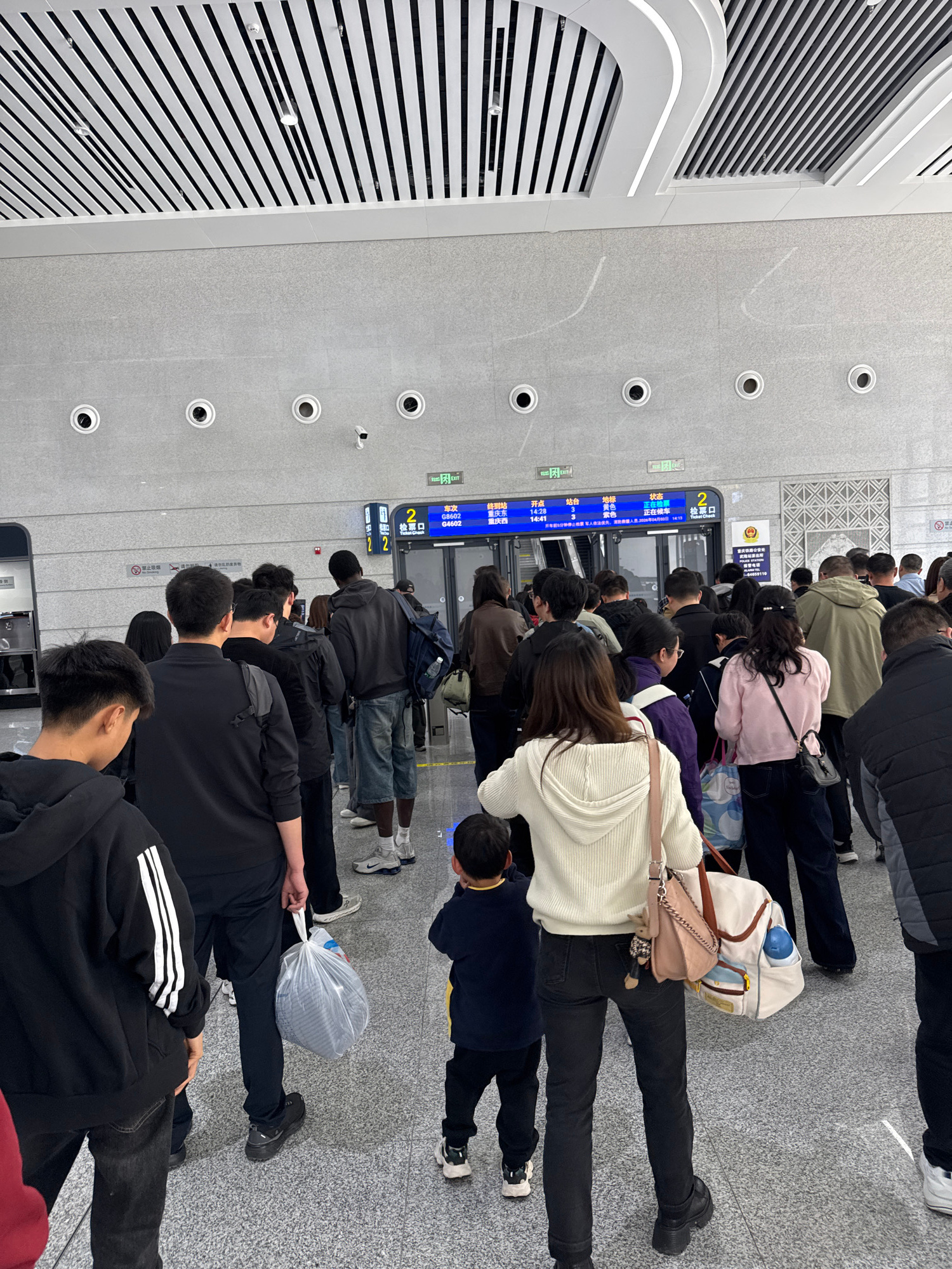 A line of people is standing in front of a gate in a transportation hub. The passengers stand in front of an electronic display, indicating that Gate 2 is for train G8602 to Chongqing East, departing…read more
