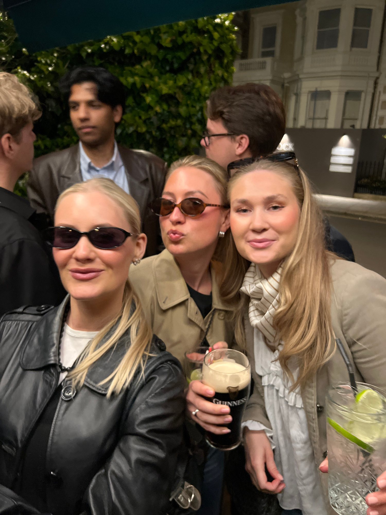 A group of people is posing for a photo outside a building in London, United Kingdom. Three women are in the foreground; all have fair complexions and blonde hair. The woman at the bottom is wearing a…read more