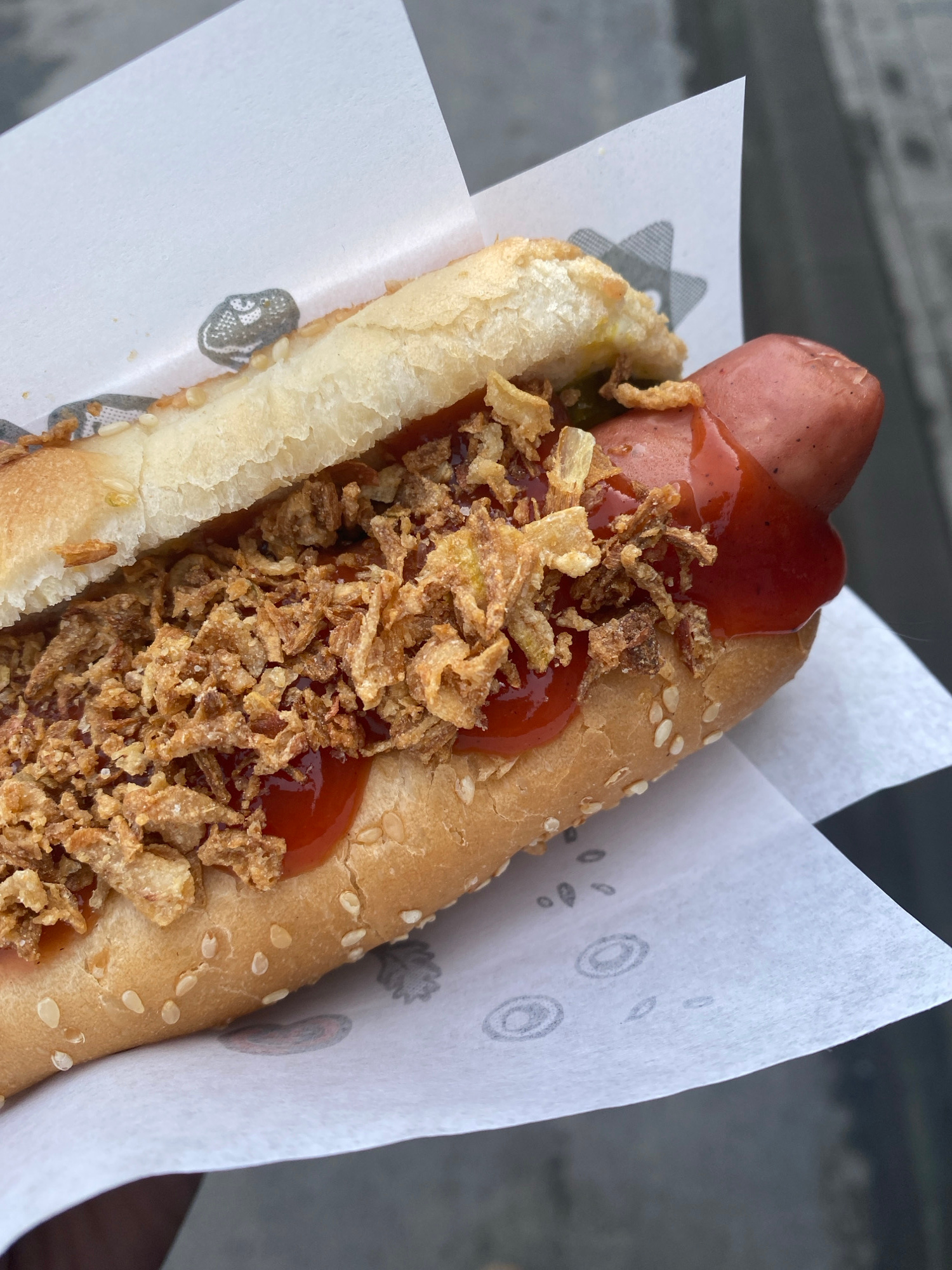 A close-up shot shows a hot dog held in a paper wrapper. The hot dog consists of a sesame seed bun, a cooked sausage, fried onions, ketchup, and a pickled condiment. The paper wrapper has a faint patt…read more
