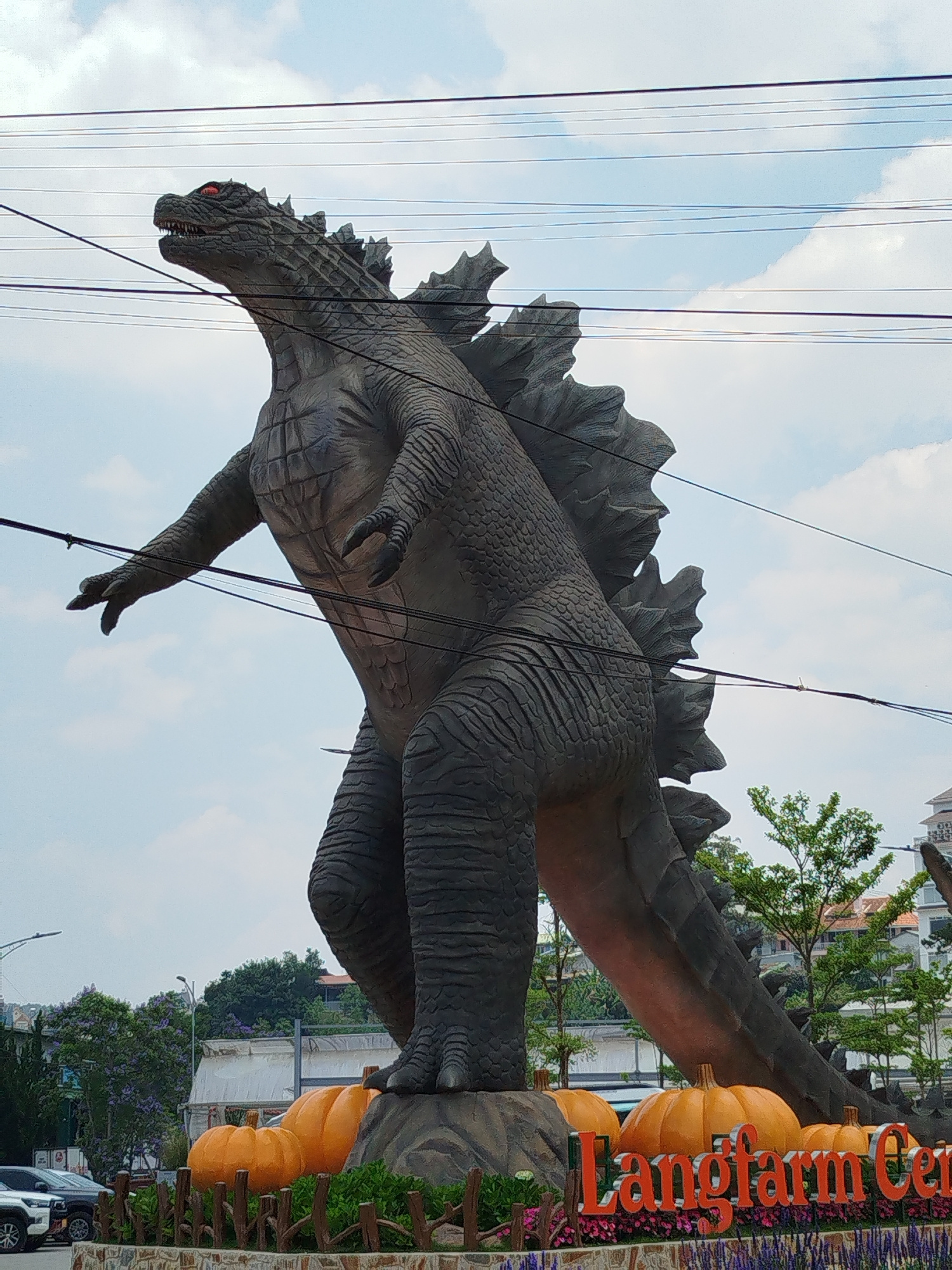 A large Godzilla statue stands in Cam Ly, Đà Lạt, Vietnam. The statue is gray, with red eyes and jagged dorsal fins. It stands on a rock platform surrounded by orange pumpkins. The words "Langfarm Cen…read more