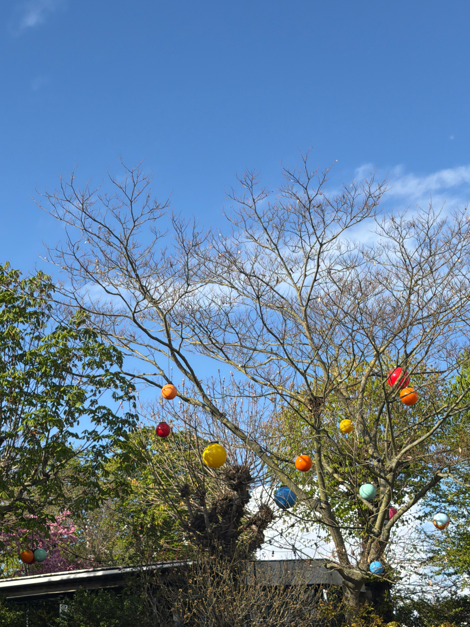 The image depicts an outdoor scene in Suresnes, France, under a clear blue sky with minimal scattered white clouds. A large, bare deciduous tree with a complex network of branches dominates the centra…read more