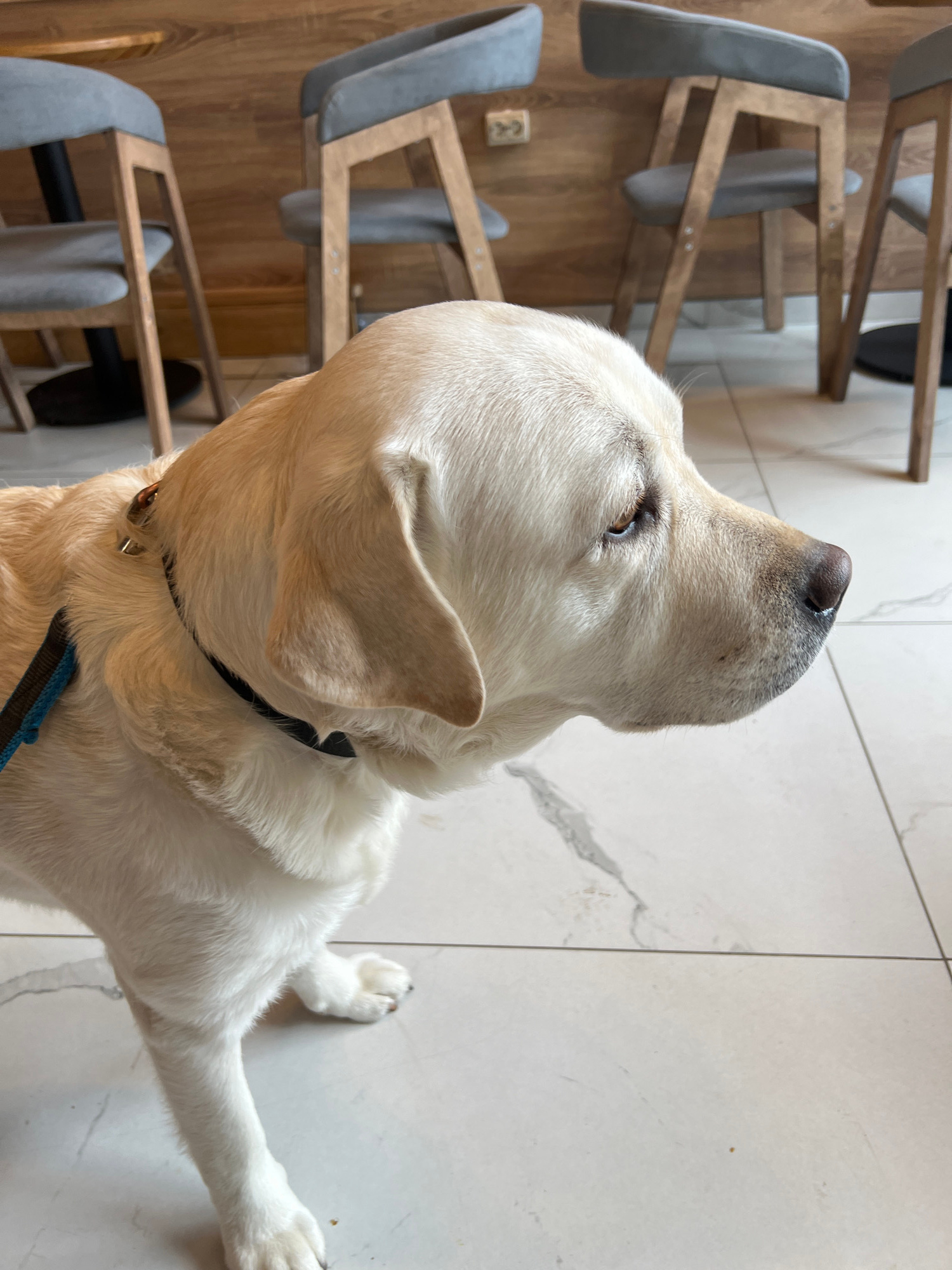 A light-colored Labrador retriever dog, likely white or yellow, is the central subject of this indoor, high-angle shot. The dog is positioned with its body partially visible, extending from the bottom…read more