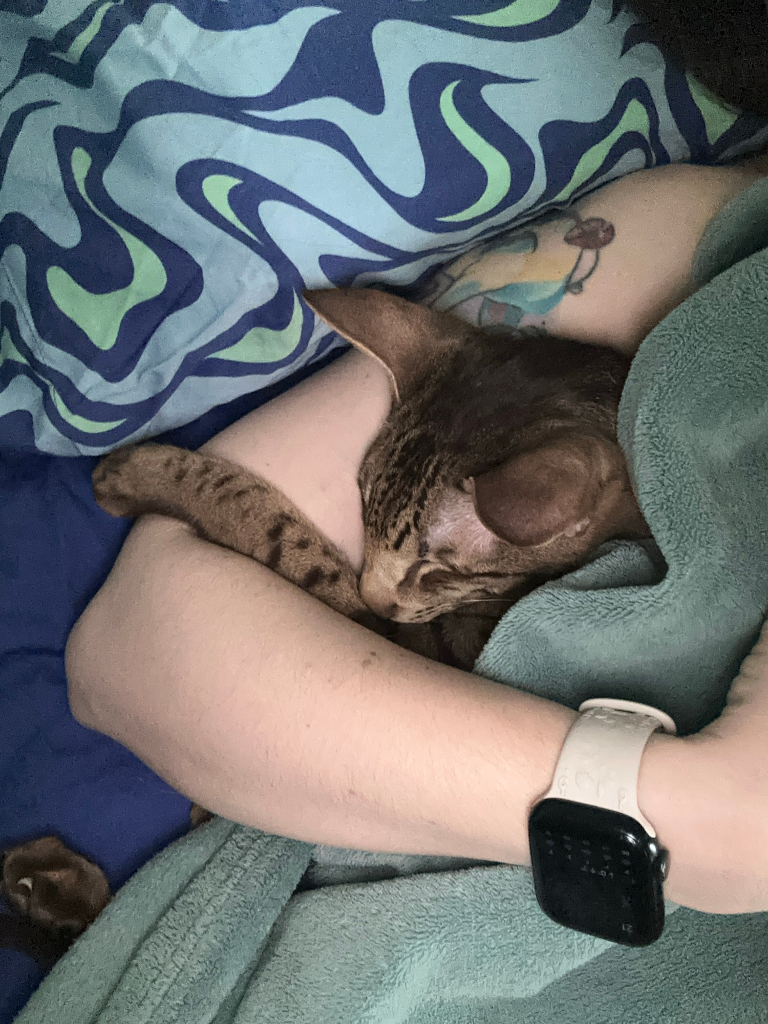 The image displays a cozy indoor scene featuring a person's arm cuddling a sleeping cat. The person, with light skin, is visible on the right, partially covered by a soft, textured green blanket. A wh…read more