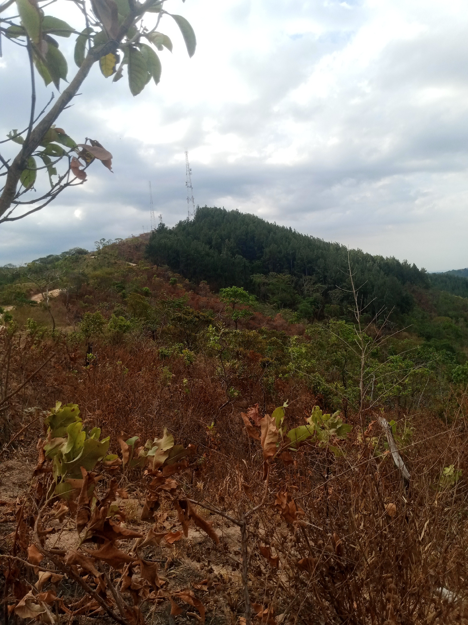 The image shows a landscape in Las Piñas, Venezuela, featuring a hillside covered with a mix of vegetation. The foreground is dominated by dry, brown shrubs and foliage. In the middle ground, there is…read more