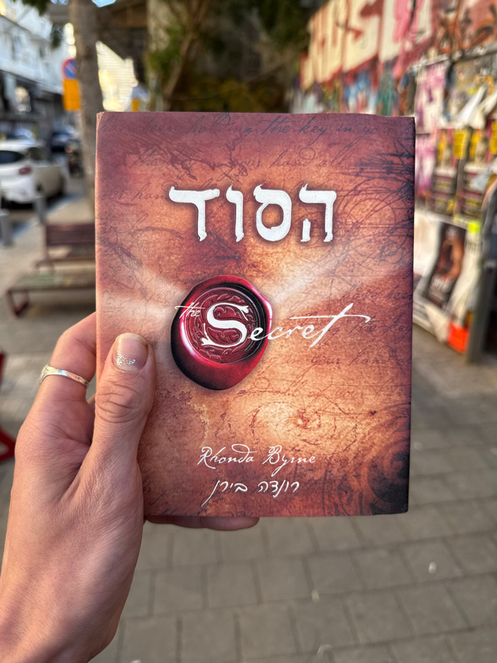 A close-up, eye-level photograph shows a person's right hand holding a copy of Rhonda Byrne's book, "The Secret" (הסוד, in Hebrew), outdoors in Tel-Aviv, Israel. The hand has a light skin tone, with a…read more