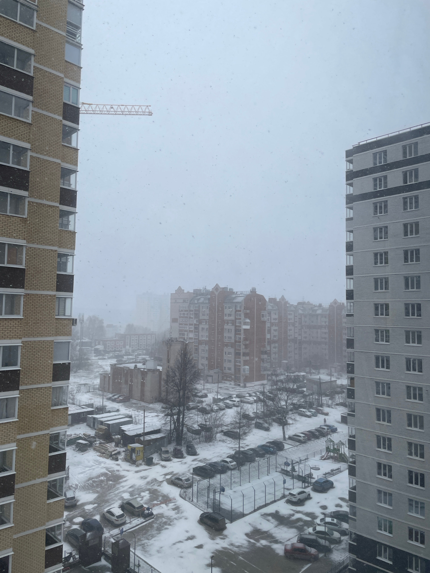 The image captures a winter scene in a city, likely Izhevsk, Russia, as suggested by the architecture. Snow is falling heavily, obscuring the background and creating a white haze. Two buildings frame…read more