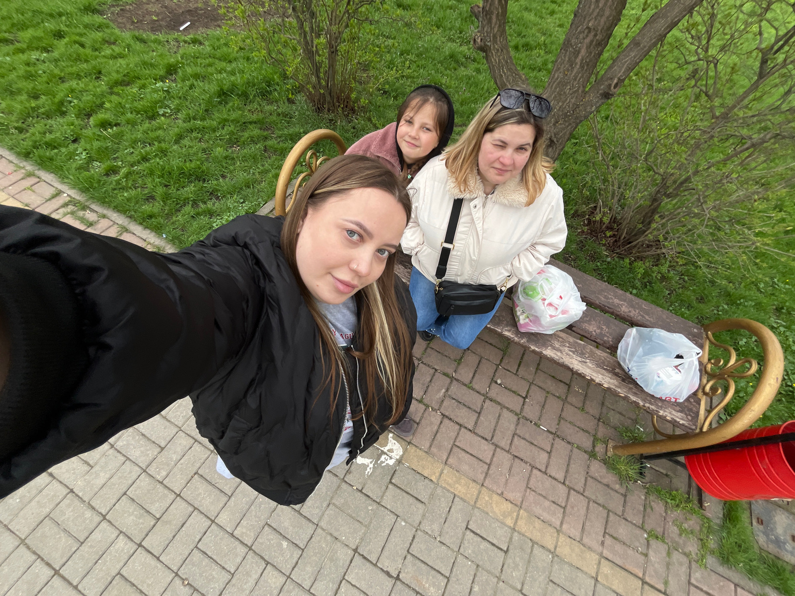 Three females are sitting on a park bench. One person wears a black jacket, another a light-colored jacket, and the third a dark-colored hooded sweatshirt. Plastic bags are on the bench next to them.…read more