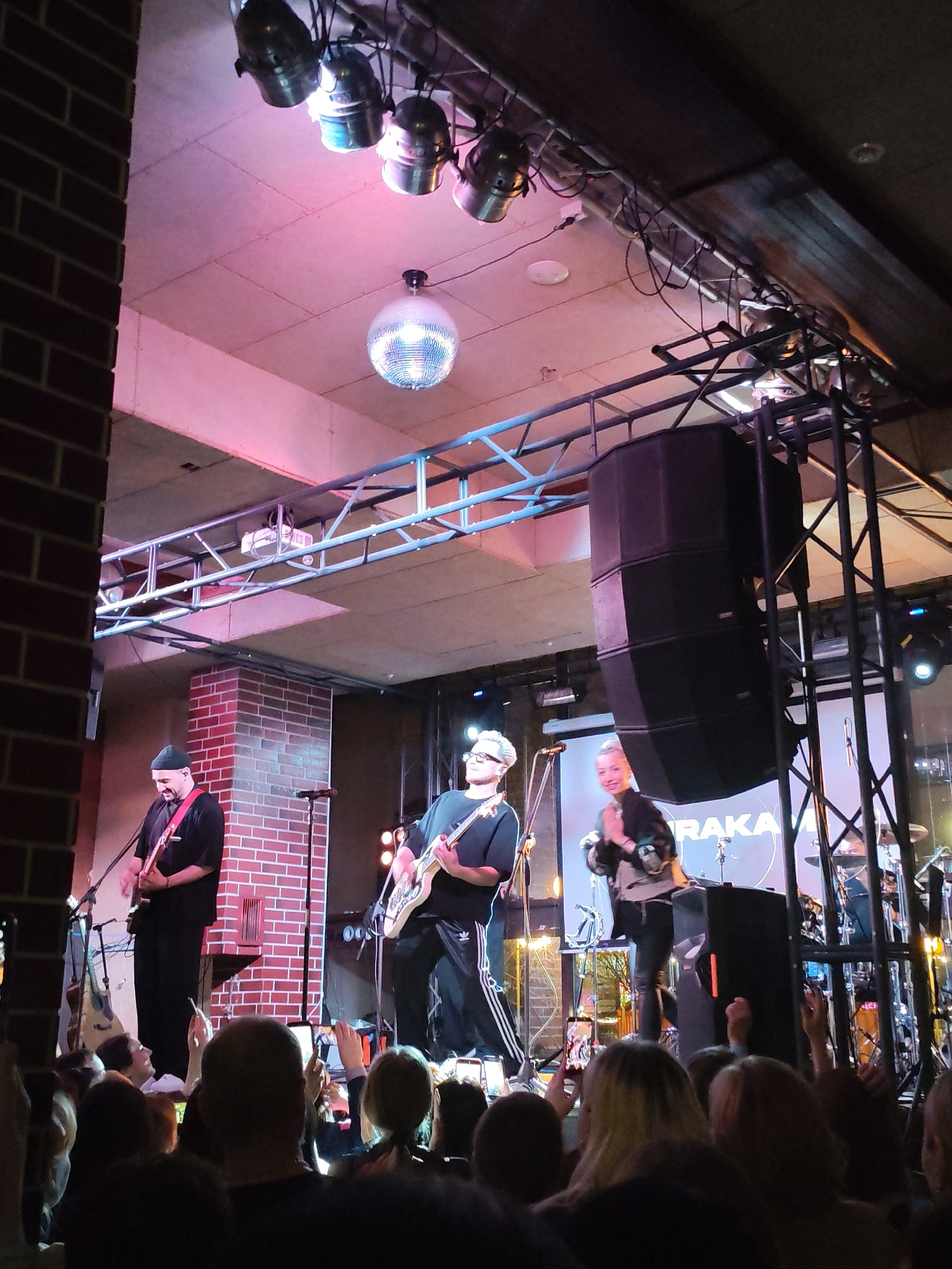 This image captures a vibrant indoor concert scene at what appears to be a club or music venue in Izhevsk, Russia. The perspective is from the audience, looking up towards the stage. Three band membeβ¦read more