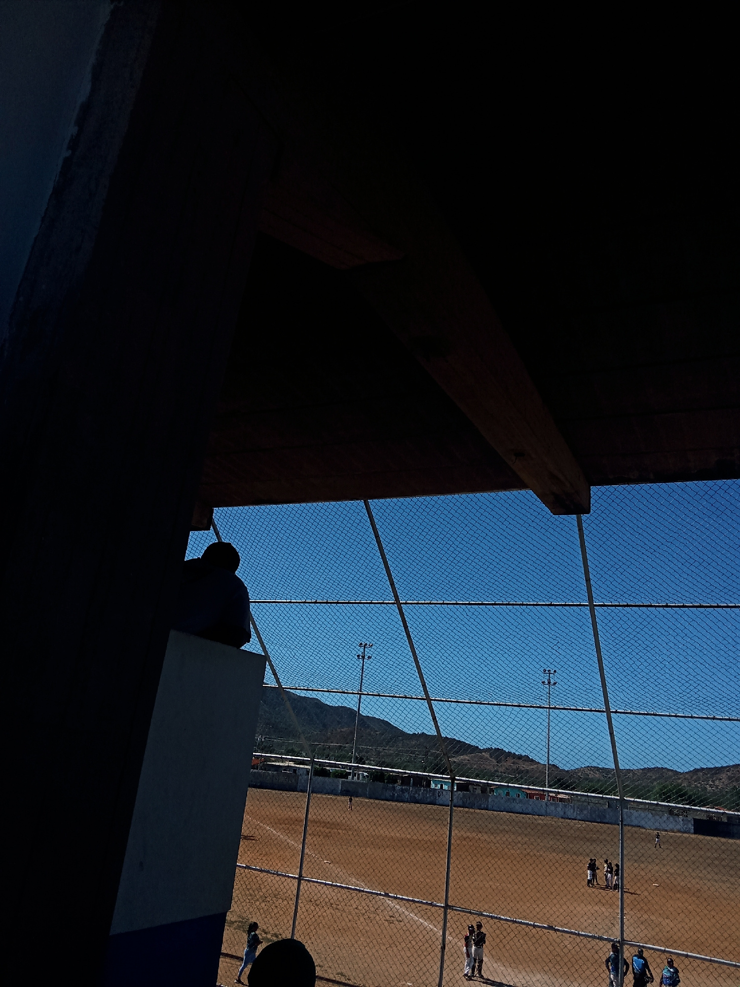 The image shows a baseball field in Juan Griego, Venezuela, viewed through a chain-link fence. The field is dirt, and several people are on it, including some who appear to be players in uniform. A mo…read more