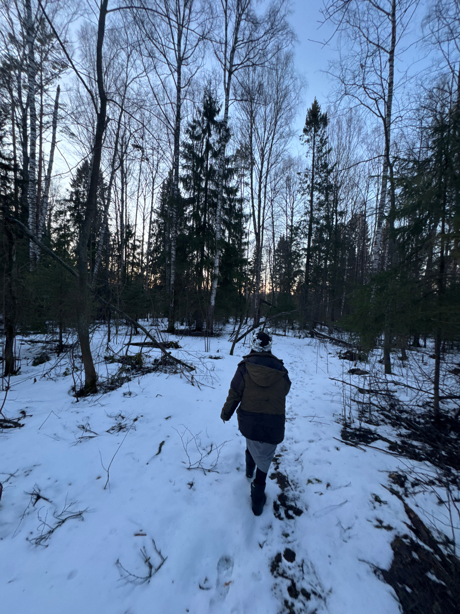 The image shows a snowy forest scene in Вассята, Russia. A person wearing a dark jacket and dark pants is walking through the snow. The forest consists of tall, thin trees, some with bare branches and…read more