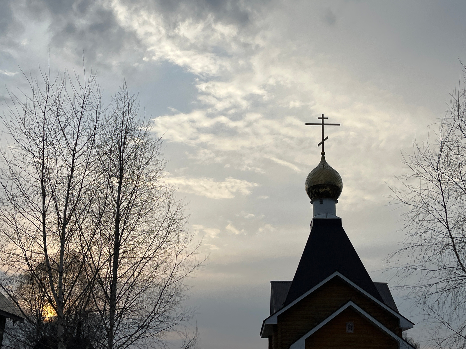 The image shows the top of a wooden structure, presumably a church, with a golden dome and a cross atop it. The architecture suggests it is located in Павловка, Russia. Two bare trees are on either si…read more