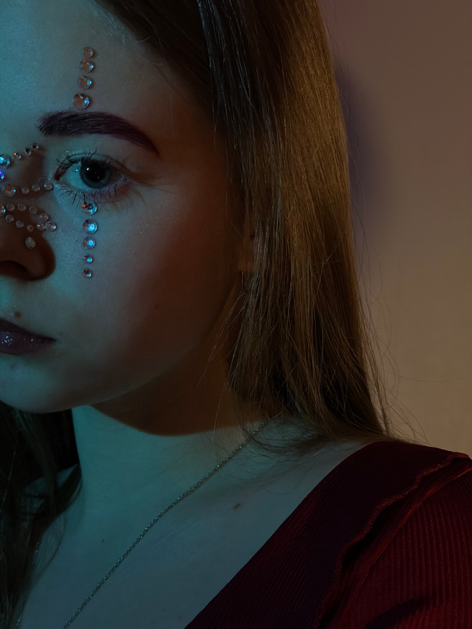 The image shows a close-up of a person's face and neck, angled towards the left. The person has fair skin, brown hair, and is wearing makeup with small rhinestones arranged around the eye and eyebrow. A silver chain necklace is visible on the neck. The background is a gradient of light colors, with a possible red garment visible in the upper right. The lighting is muted and appears to be artificially produced, casting a cool hue on the scene. There is no information to indicate the location is in Perm, Russia. | Open Wire