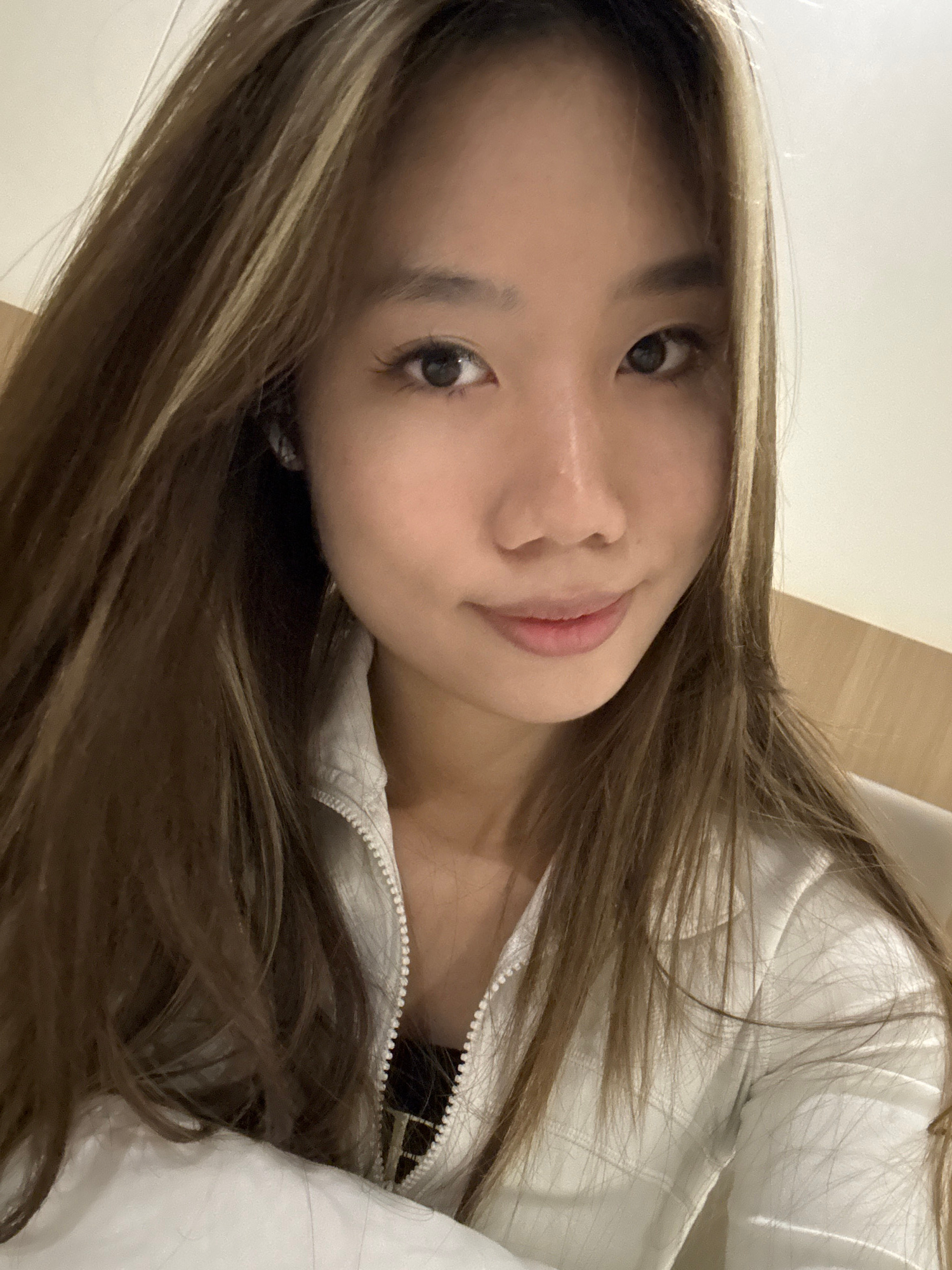 A close-up, slightly angled portrait captures an Asian woman with long, brown hair highlighted with blonde streaks. She has fair skin, brown eyes, and a slight smile. She appears to be wearing a white…read more