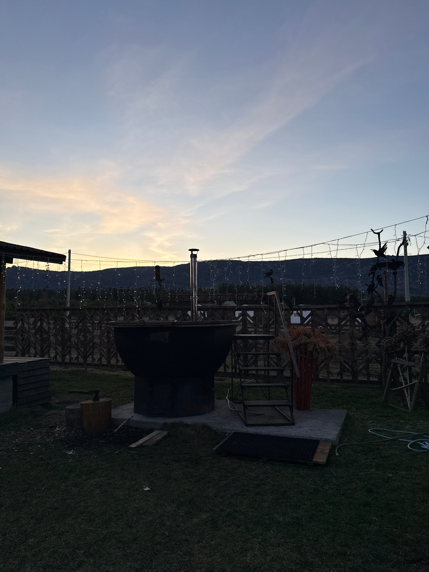 The image shows an outdoor scene with a metal structure and what appears to be a wood-burning hot tub or stove. The background features a mountain range and a sky with some clouds. The scene is possib…read more