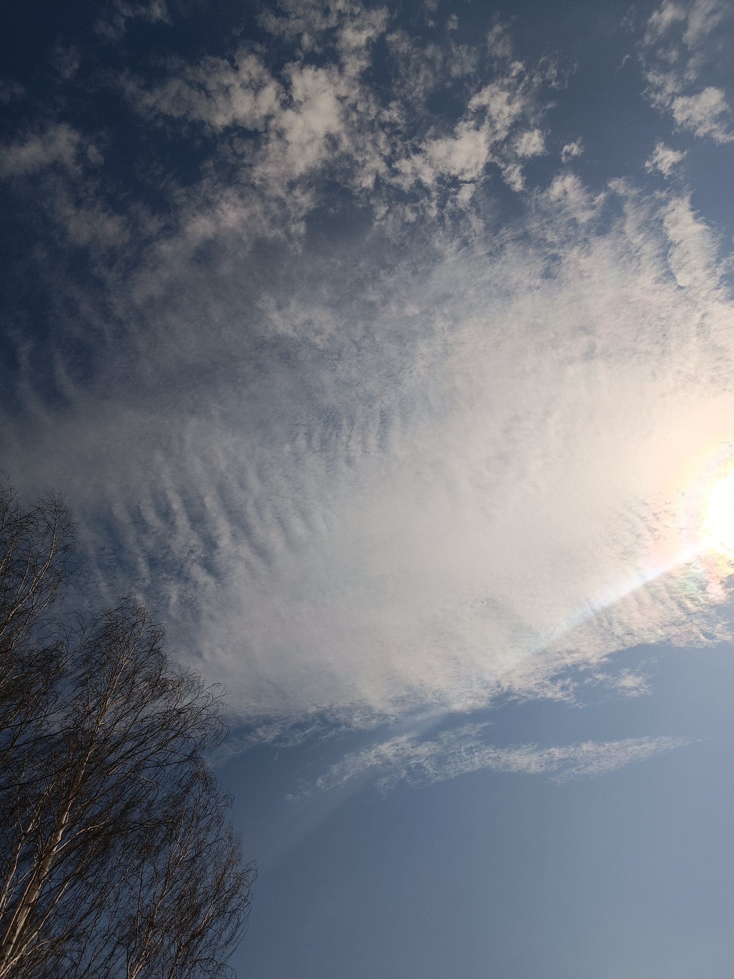 This media file captures a wide-angle outdoor view of a bright, partly cloudy sky. The main subjects are the expansive blue sky, various cloud formations, and the upper branches of a bare deciduous tr…read more
