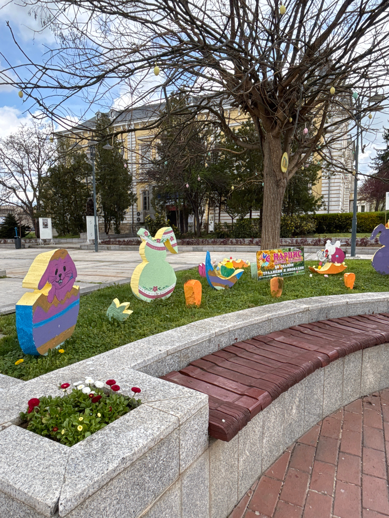 The image depicts a city park in Silistra, Bulgaria. On the left side, a raised flower bed and a bench are visible. Along the green grass area, numerous colorful, stylized, cartoonish Easter decoratio…read more