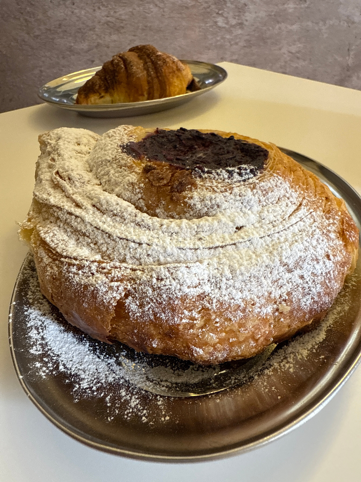 The image displays two pastries on small, round metallic plates, likely placed on a table in an indoor setting. The prominent subject is a large, golden-brown, croissant-like pastry, generously dustedβ¦read more