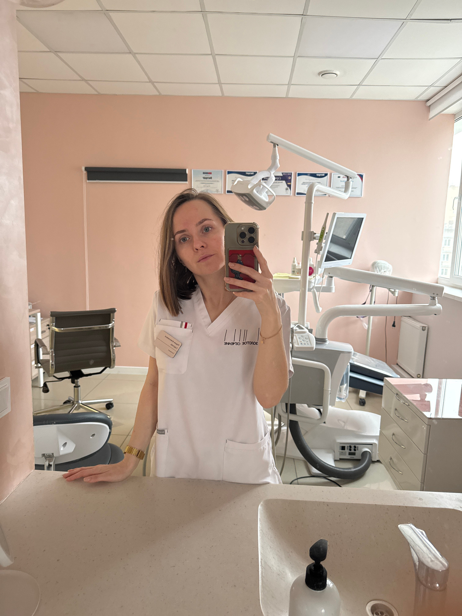 A woman is reflected in a mirror, holding a smartphone in her left hand to take a selfie. She is wearing a white medical uniform with a name tag and a logo that reads "ЗОЛОТОЕ СЕЧЕНИЕ" in Russian, sug…read more