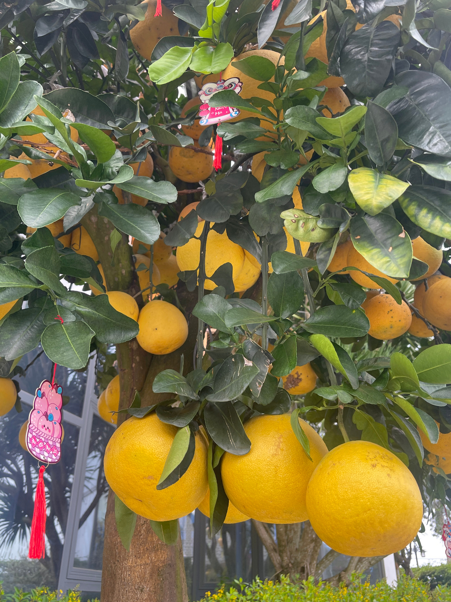 The image shows a citrus tree laden with large, yellow pomelos, densely packed among green leaves. A pink and white decorative ornament with a red tassel hangs on the tree. The background appears to b…read more