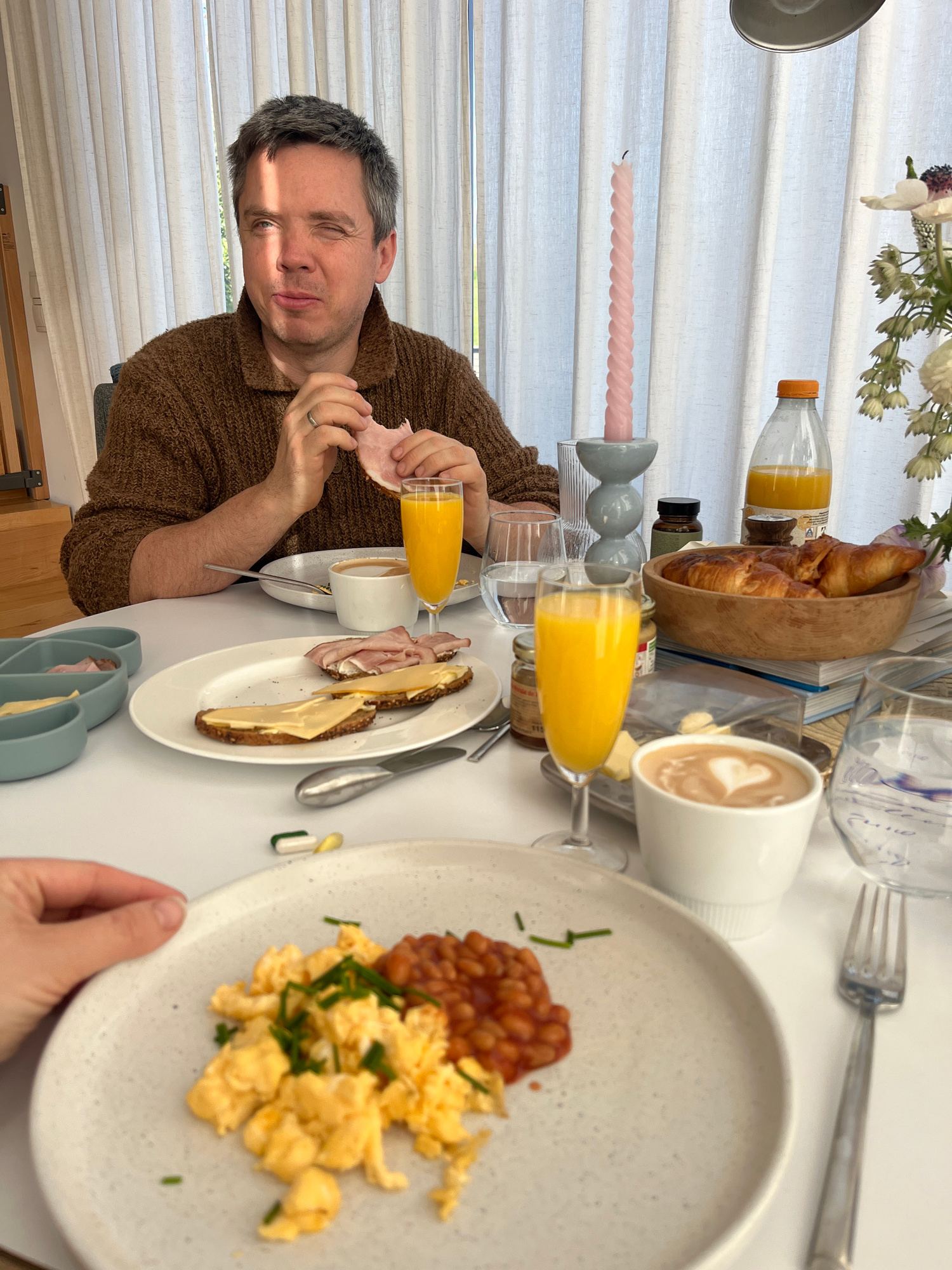 The image depicts an indoor breakfast scene. A man is seated at a white table. He is wearing a brown sweater and holding a piece of ham. On the table, there is a plate of scrambled eggs and beans, a s…read more
