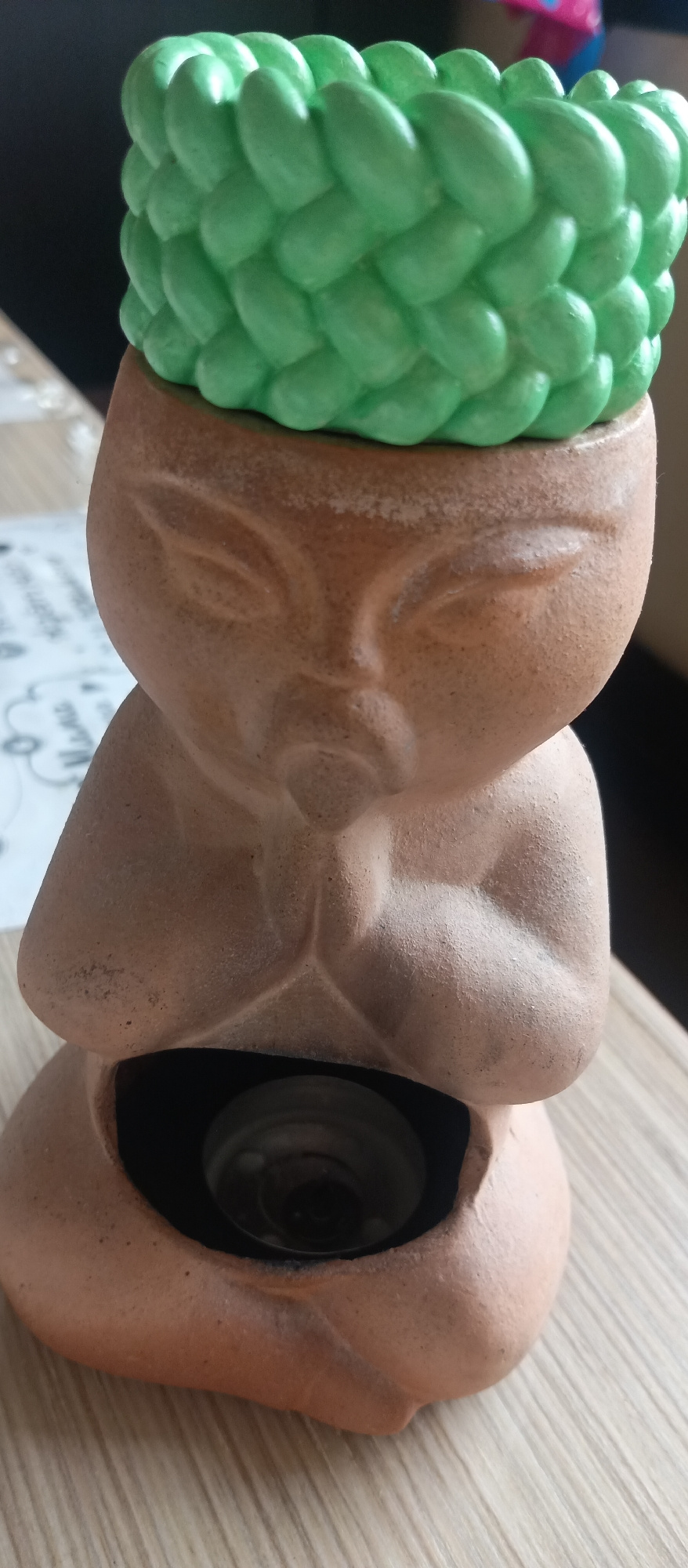 The image shows a terracotta statue of a figure with a stylized face and hands clasped in front of its chest. A green, braided-looking object sits atop the figure's head. The statue has an opening in…read more