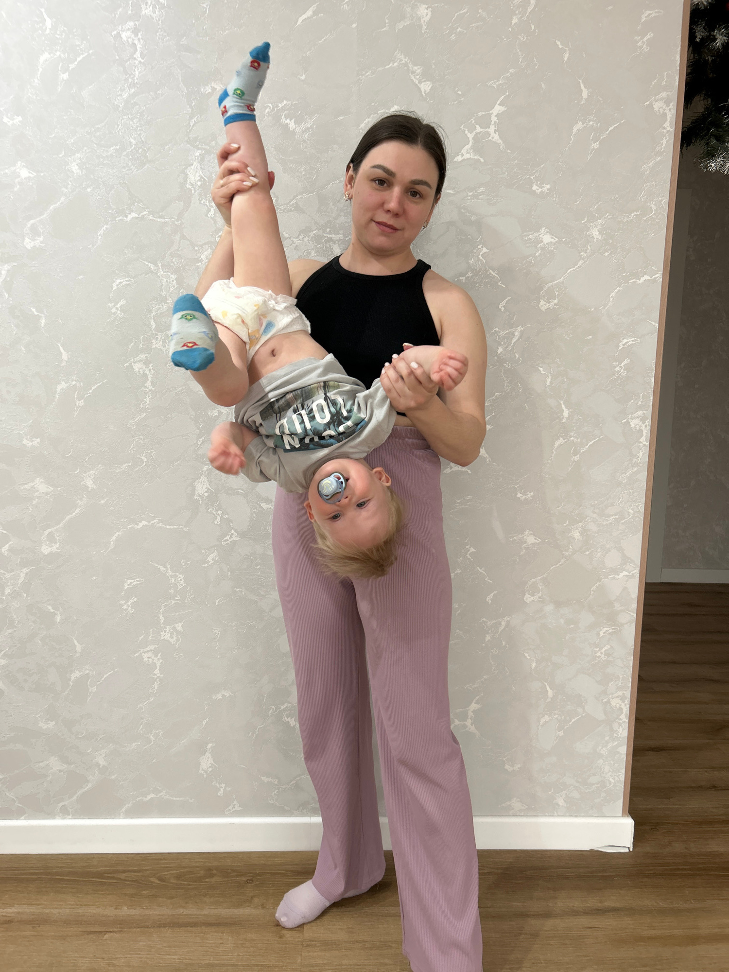 The image depicts a woman lying on a light-colored, possibly marble-patterned surface with wood flooring visible on the right side of the frame. The woman is wearing a black sleeveless top and lilac-c…read more