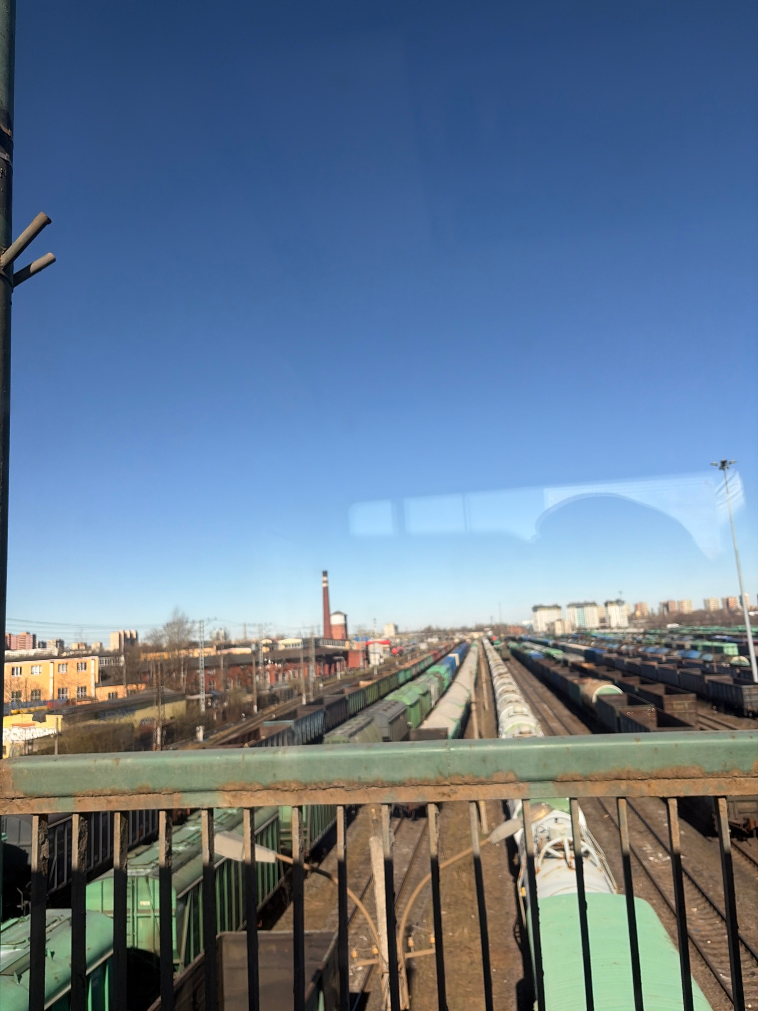 The image shows a view from an elevated position, possibly a bridge or high structure, overlooking a railway yard in Saint Petersburg, Russia. The sky is a clear, bright blue, with a reflection of a l…read more