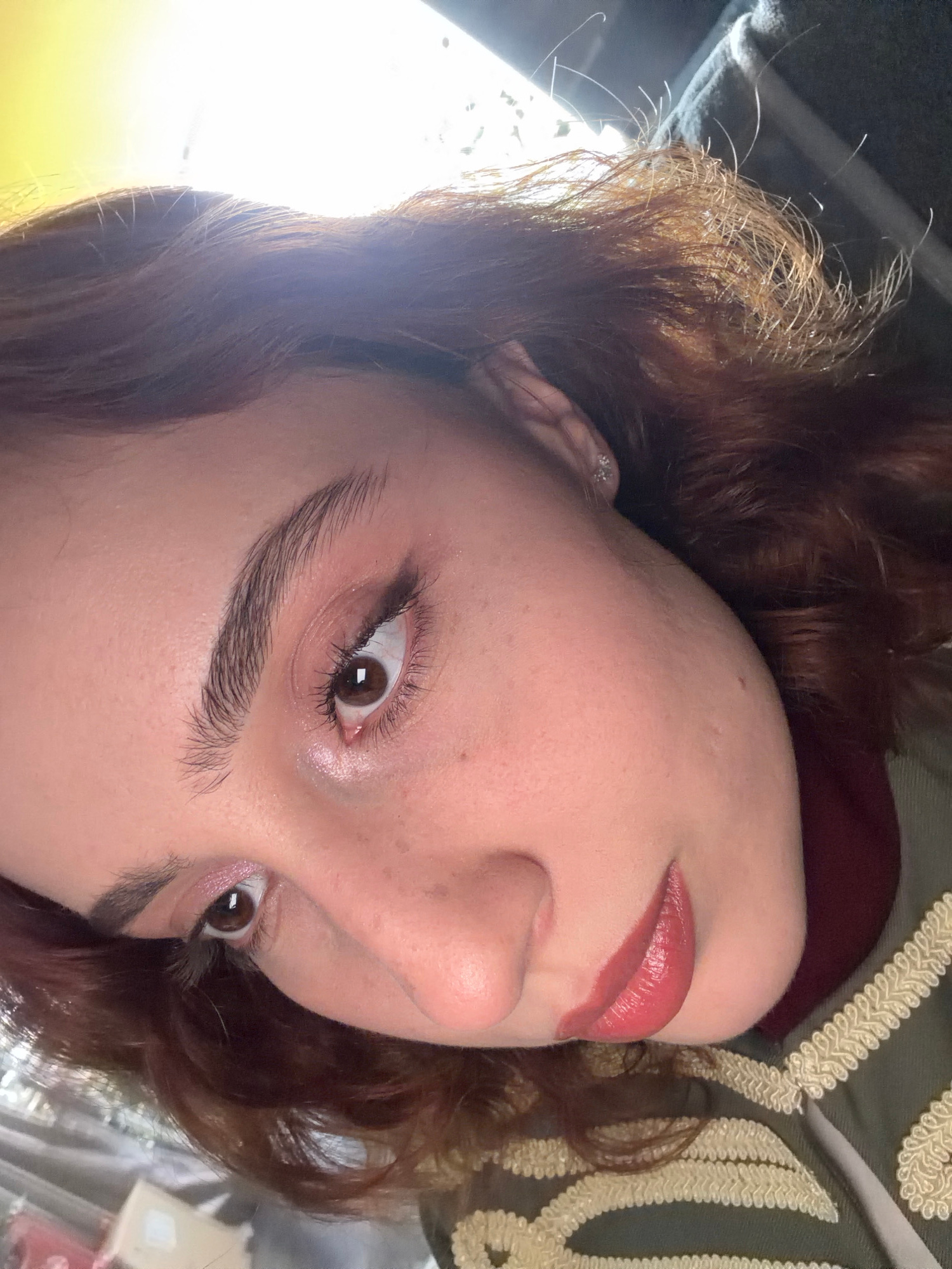 A close-up, slightly rotated image shows a person with light skin, brown eyes, and reddish-brown hair. The person has styled eyebrows and is wearing lipstick. The background includes a patterned fabri…read more