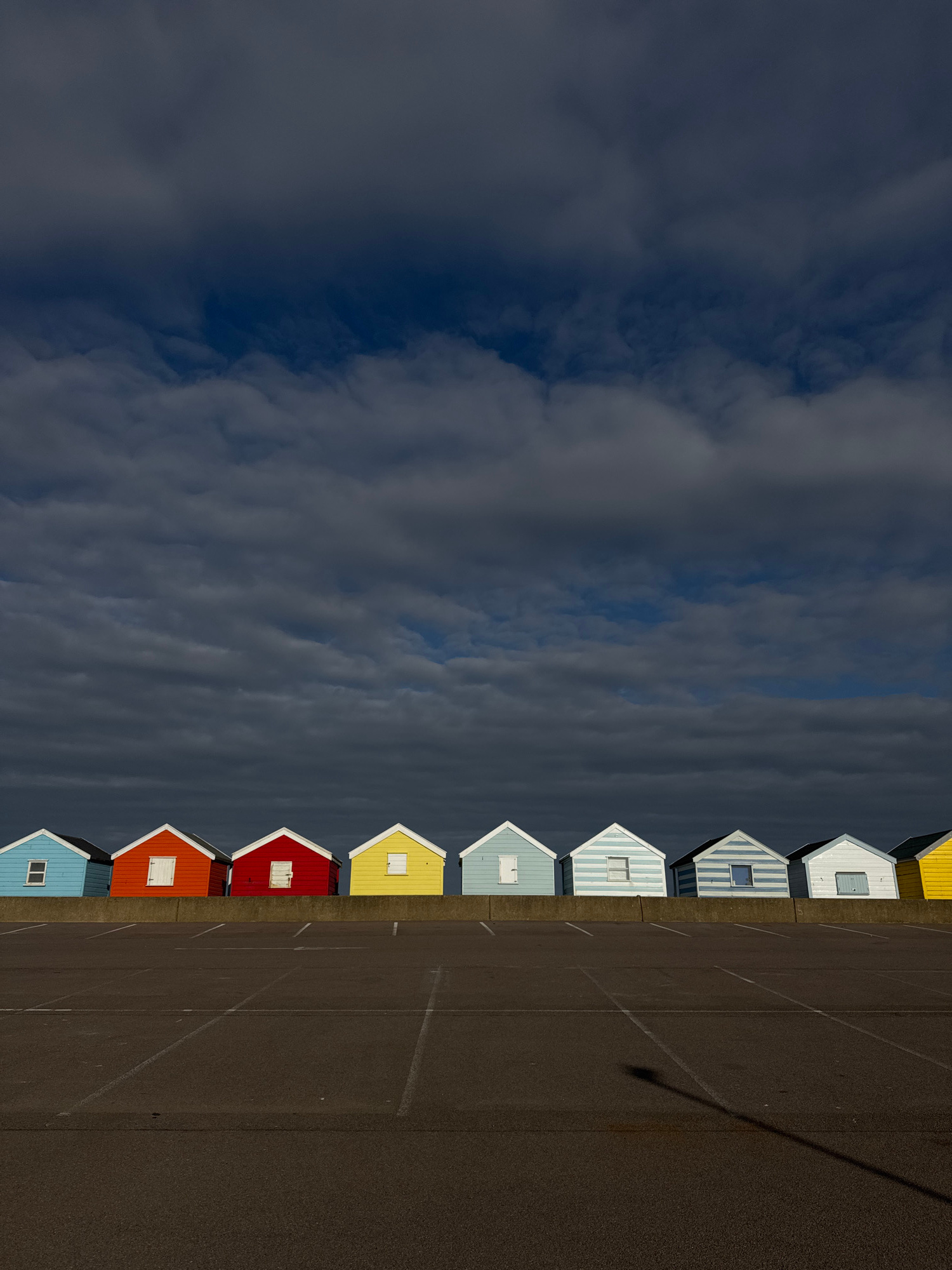 The image shows a row of beach huts in East Suffolk, United Kingdom. The huts are painted in various bright colors. The background consists of a cloudy sky and a paved surface. The picture is taken fr…read more