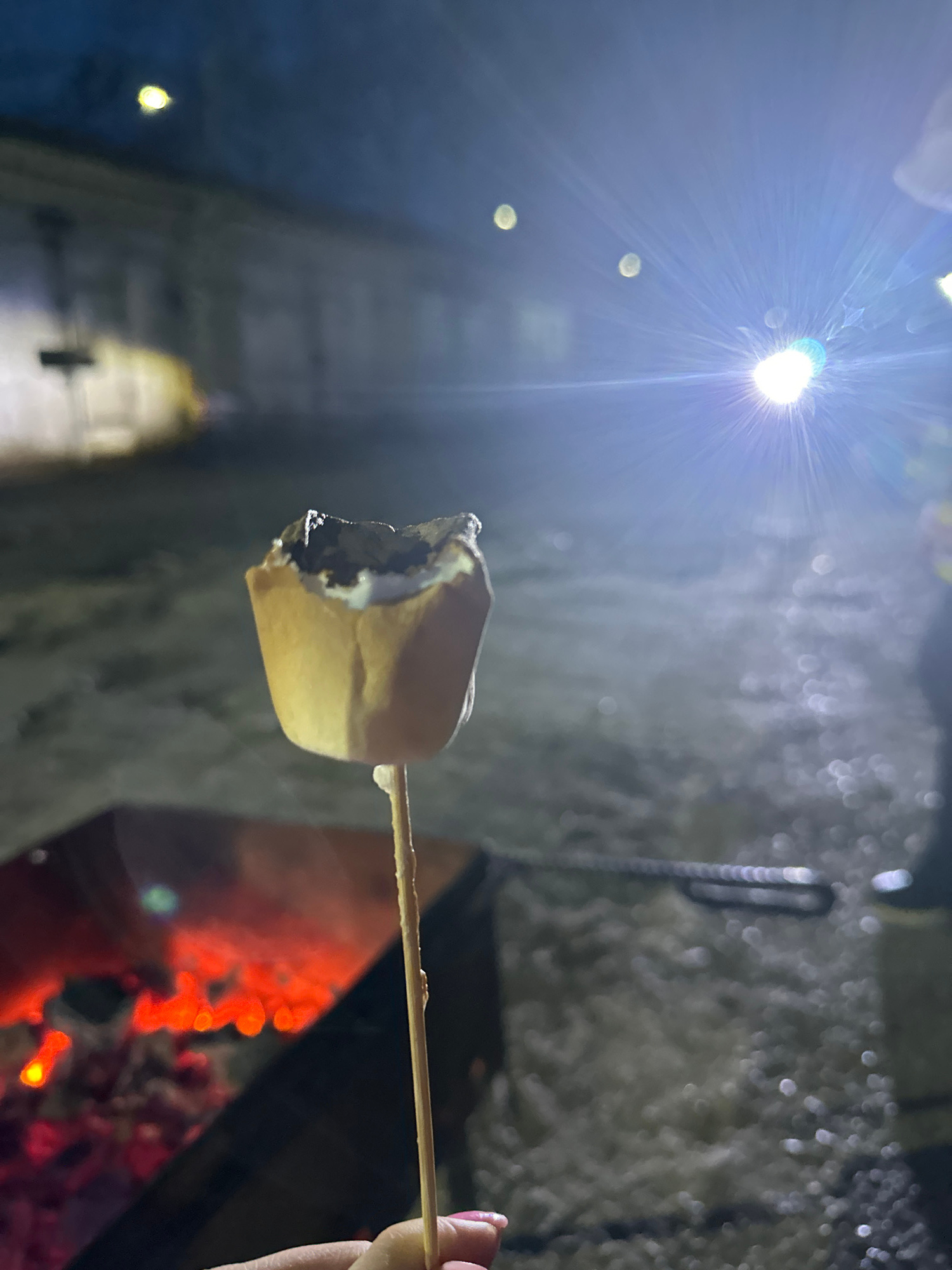 The image captures a close-up of a partially toasted marshmallow on a wooden skewer, held by a person's hand in the lower right. The marshmallow is light brown, with some darker, possibly burnt or eat…read more