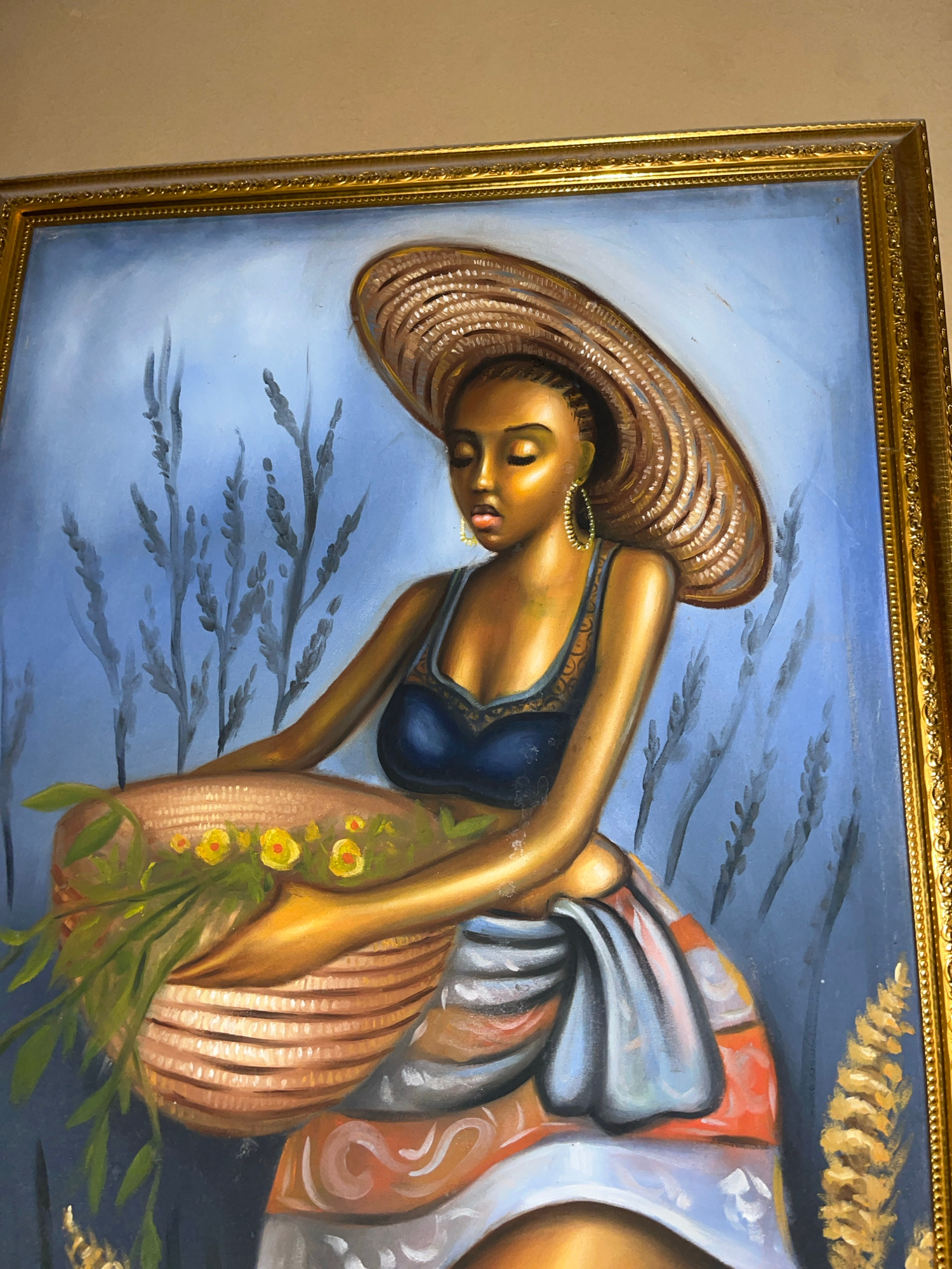 The image is a close-up of a framed oil painting. The painting depicts a Black woman wearing a wide-brimmed hat and a blue top. She is leaning over what appears to be a woven basket with flowers and f…read more