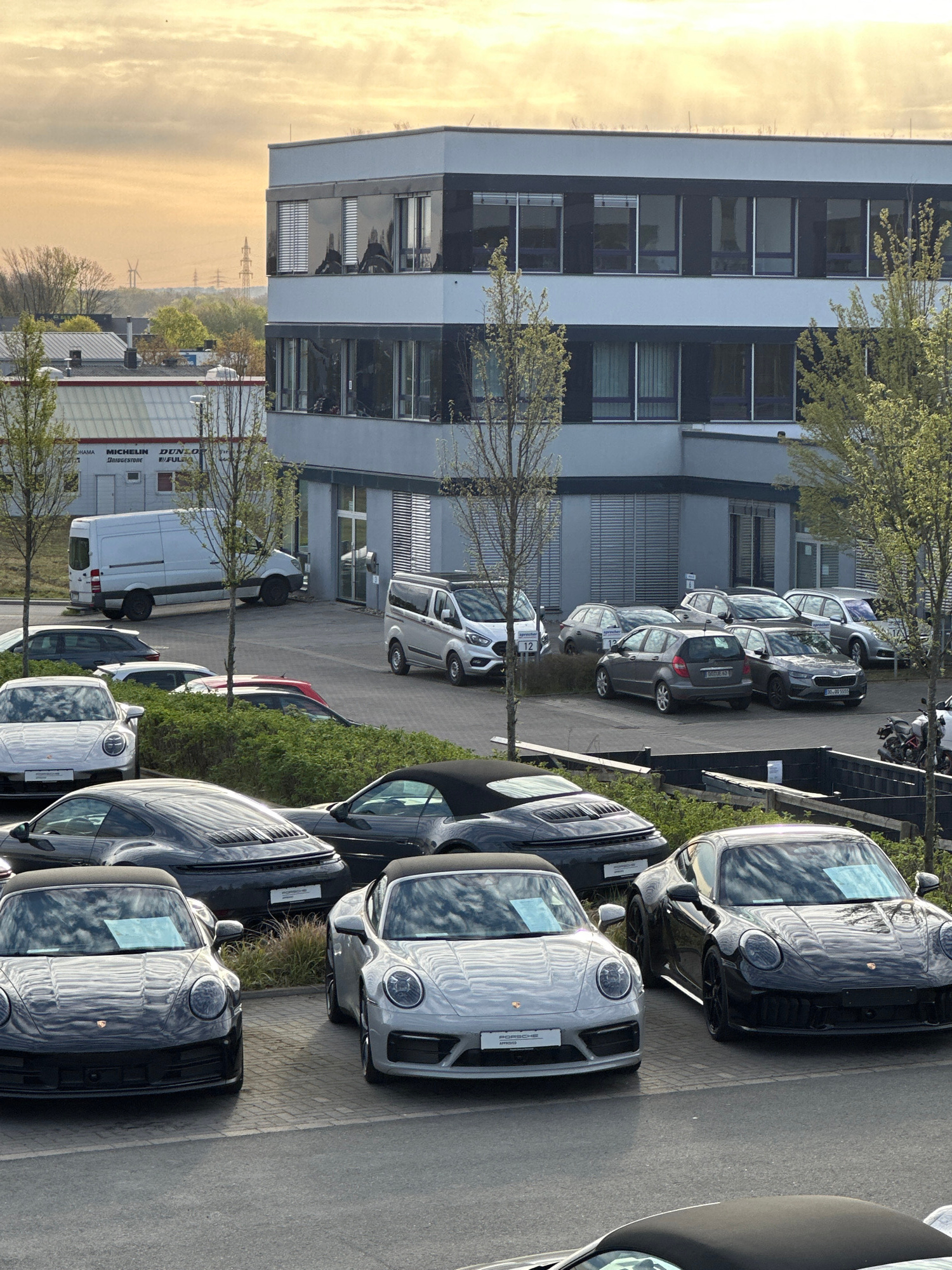 The image shows an outdoor scene in Holzwickede, Germany. A modern, multi-story building with a light gray facade and dark window frames is prominently featured. In the foreground, there is a row of p…read more
