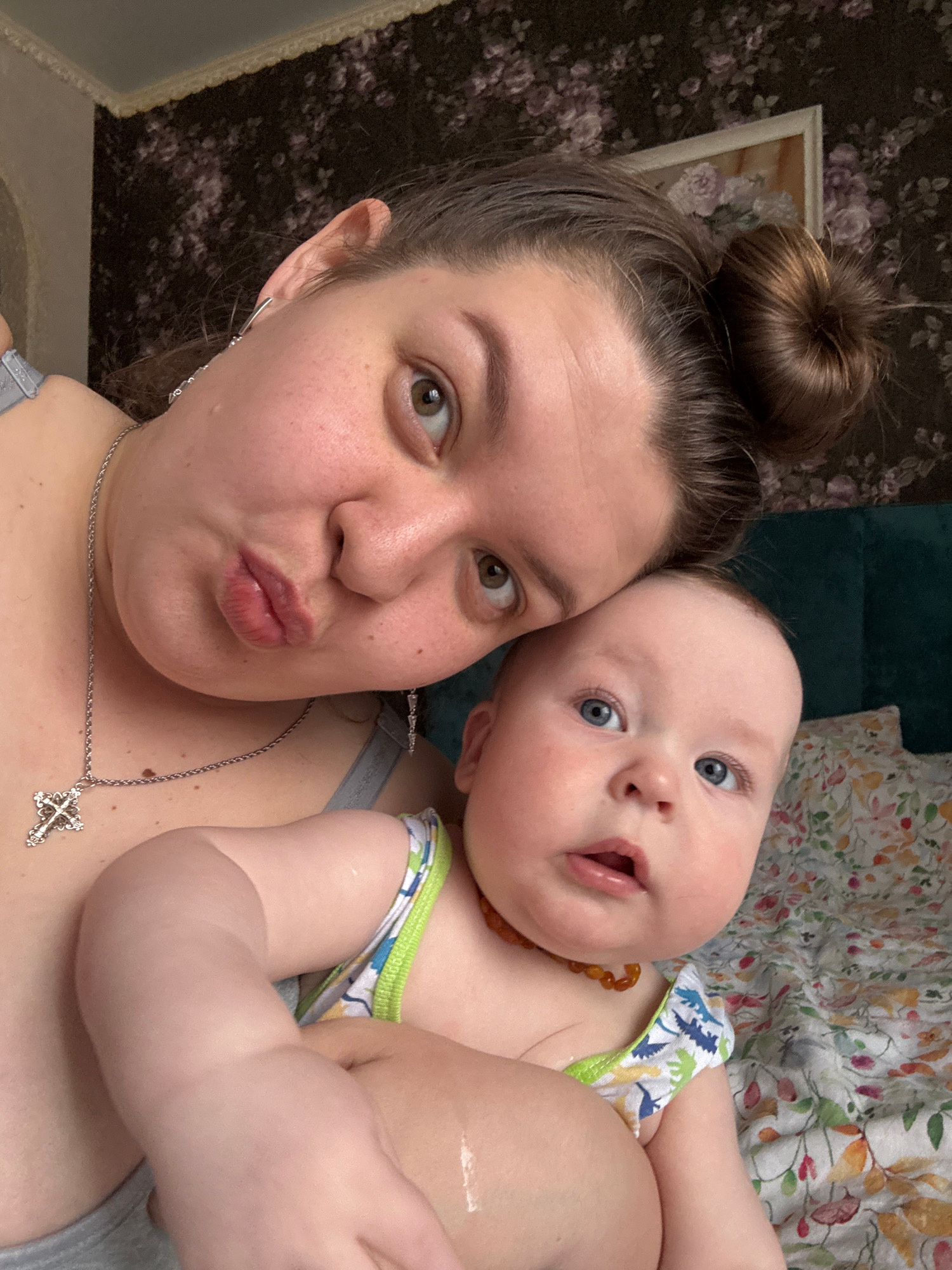 A woman and a baby are positioned close together, presumably taking a selfie. The woman has brown hair pulled back in a bun and is wearing a silver necklace with a cross pendant. She is looking at the…read more