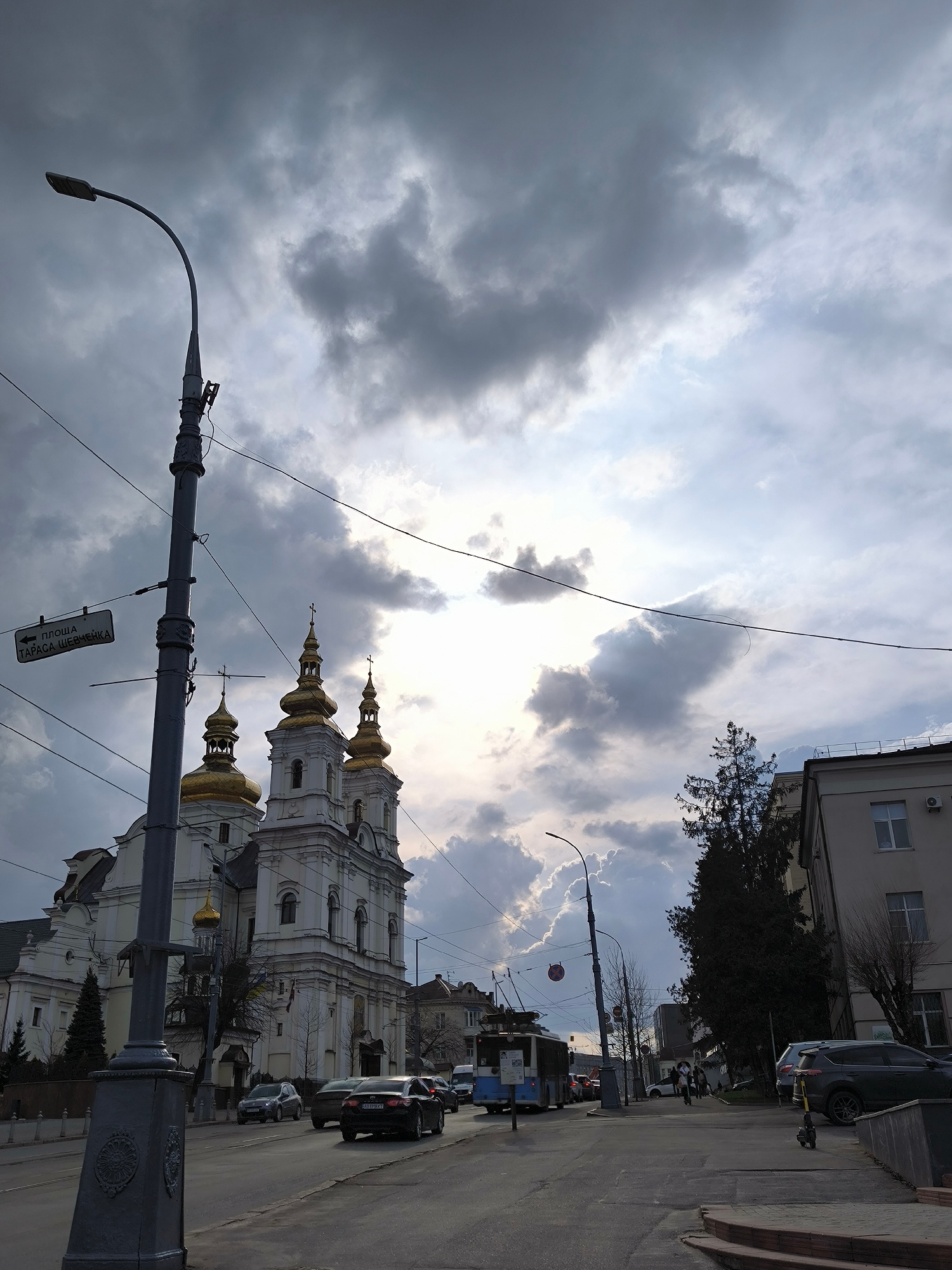 The image shows a street scene in Vinnytsia, Ukraine. In the foreground is a street with cars and a trolleybus. A pedestrian is crossing the street. A street lamp with a sign pointing towards "Ploscha…read more