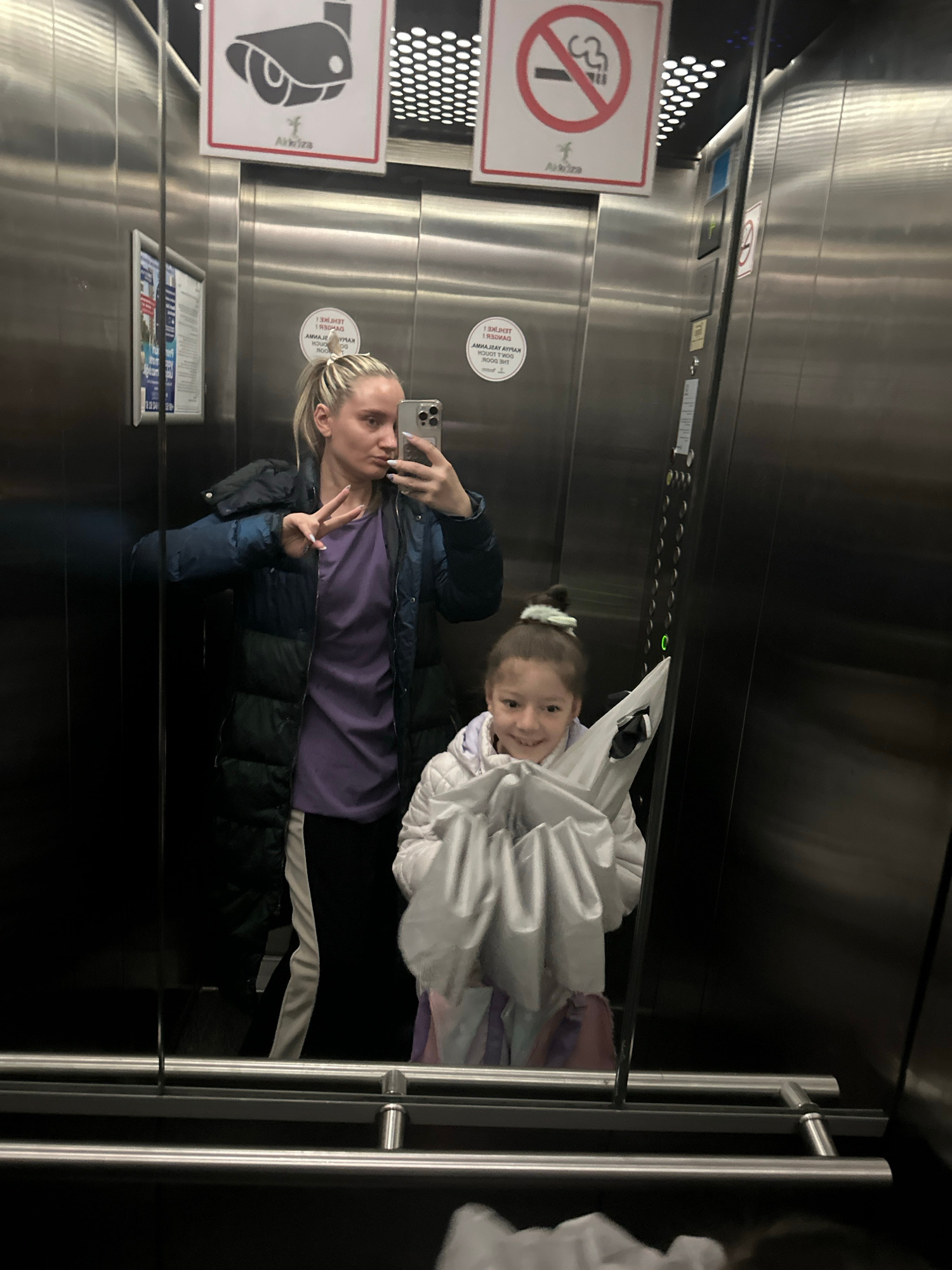 A photograph taken inside of a modern elevator located in Esenyurt, Turkey. The elevator walls are stainless steel, and signs are present on the wall, including "No Smoking" and a local business adverβ¦read more