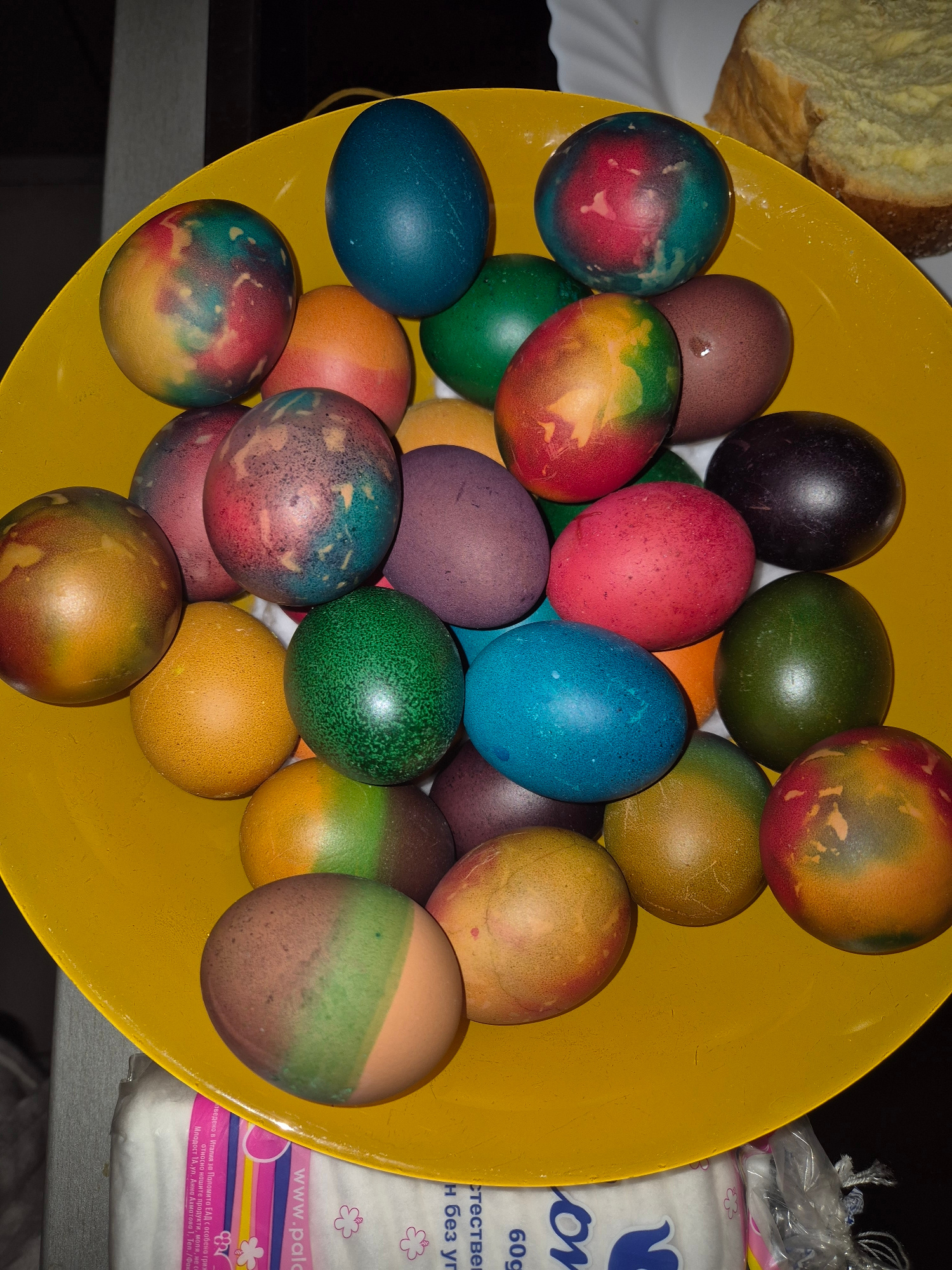 A top-down, close-up shot displays a yellow bowl filled with a variety of dyed Easter eggs in various colors, including blue, green, red, purple, and orange, some with mixed colors, suggesting a tradi…read more