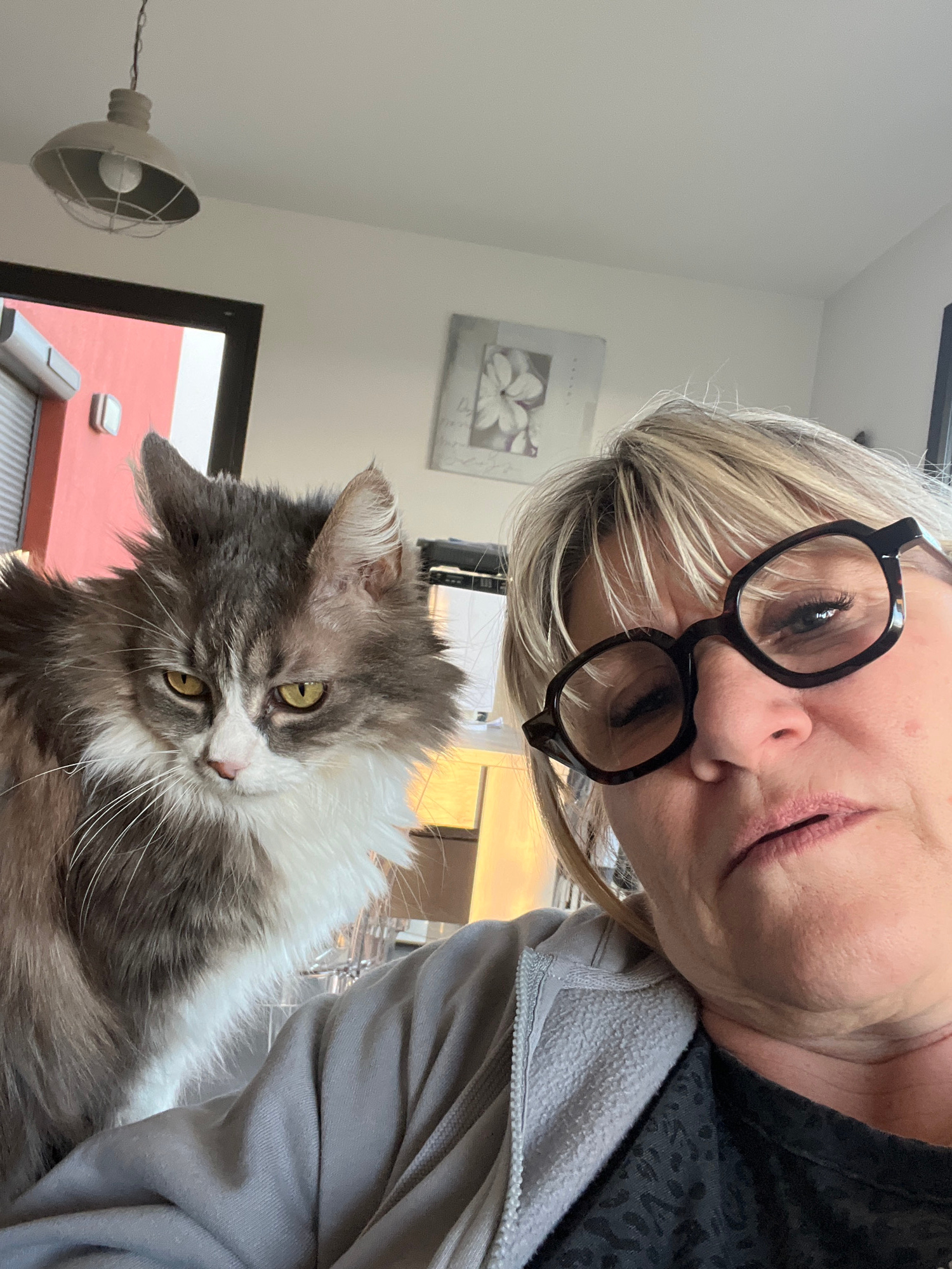 The image depicts an indoor scene in Chambœuf, France, featuring an adult female and a domestic cat in close proximity. The female, positioned on the right side of the frame, has blonde hair and wears…read more