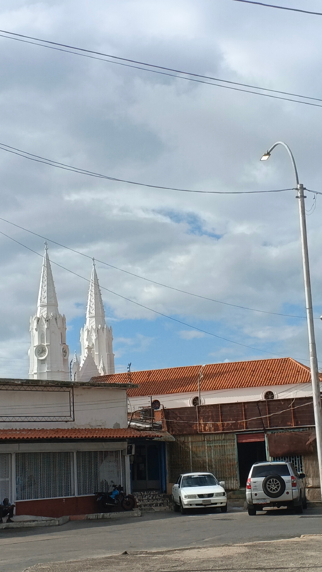 The image shows a street scene in Juan Griego, Venezuela. Two prominent white church spires are visible in the background, rising above the buildings. A building with a red tile roof and dark rusted bars is on the right side of the image. Two cars are parked in front of the building: a white sedan and a silver SUV with a spare tire mounted on the back. A smaller building with a red-tiled roof and barred windows is to the left, in front of which sits a motorcycle and a person on the sidewalk. Overhead, electrical wires stretch across the sky. A street lamp stands on the right edge of the frame. The sky is filled with grey and white clouds with patches of blue sky visible. | Open Wire