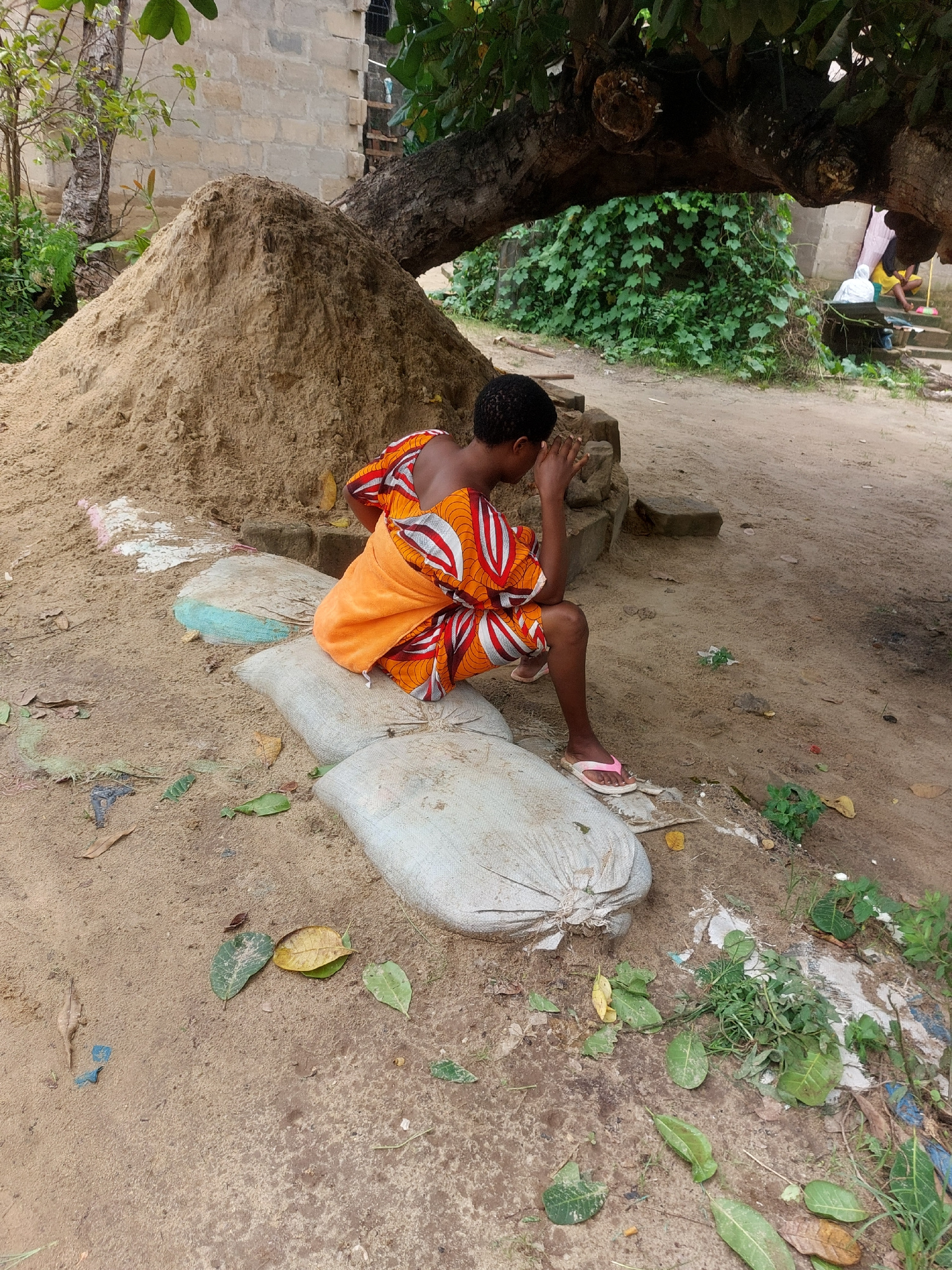 A young person wearing an orange and white patterned cloth sits on a pile of sandbags near a tree. The ground is sandy and has leaves scattered on it. The location appears to be outdoors in Dar es-Sal…read more