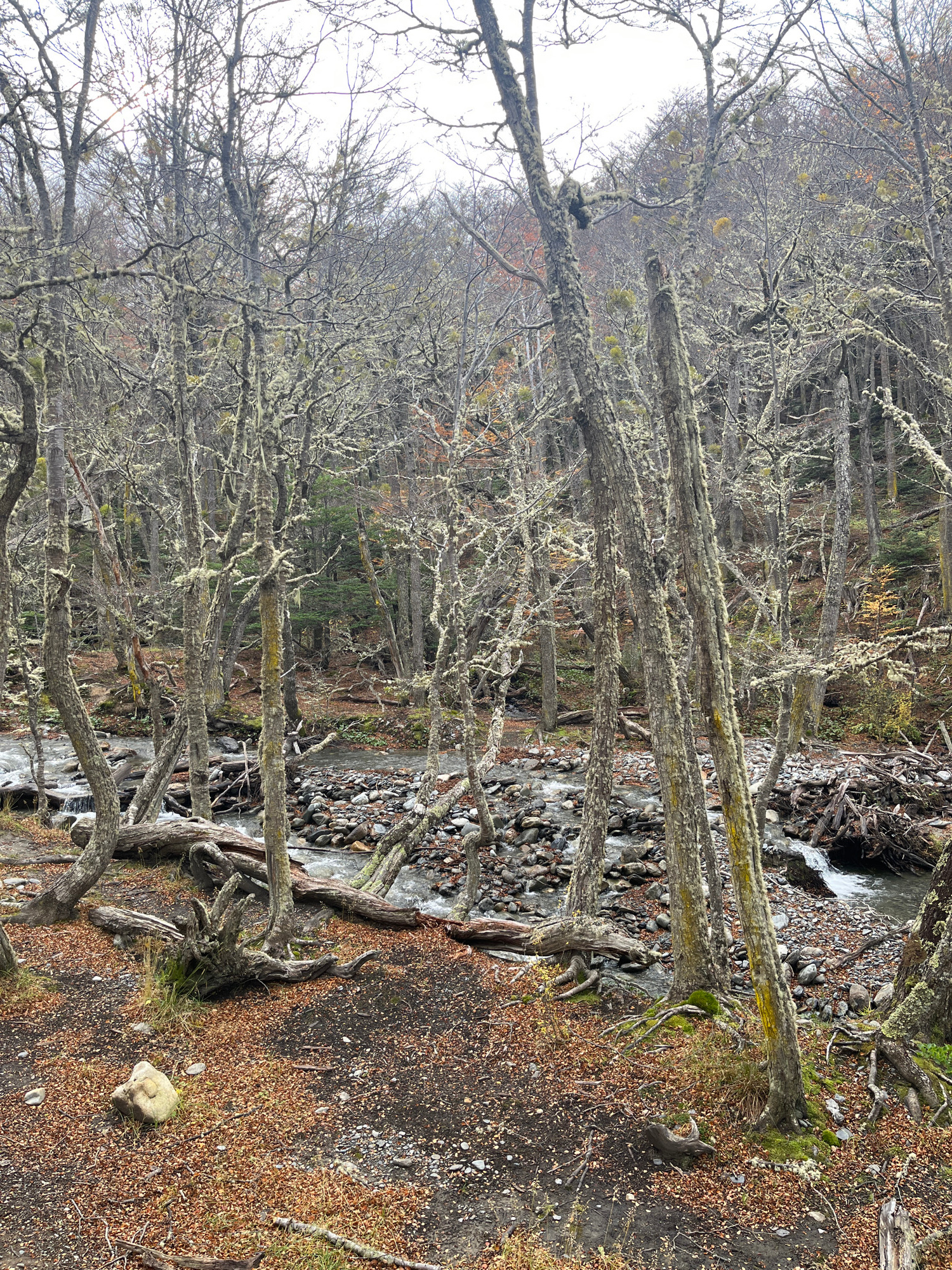 The image shows a forest scene in Ushuaia, Argentina. A stream runs through the center of the frame, with its rocky bed visible under the flowing water. The trees are bare, covered with light-colored…read more