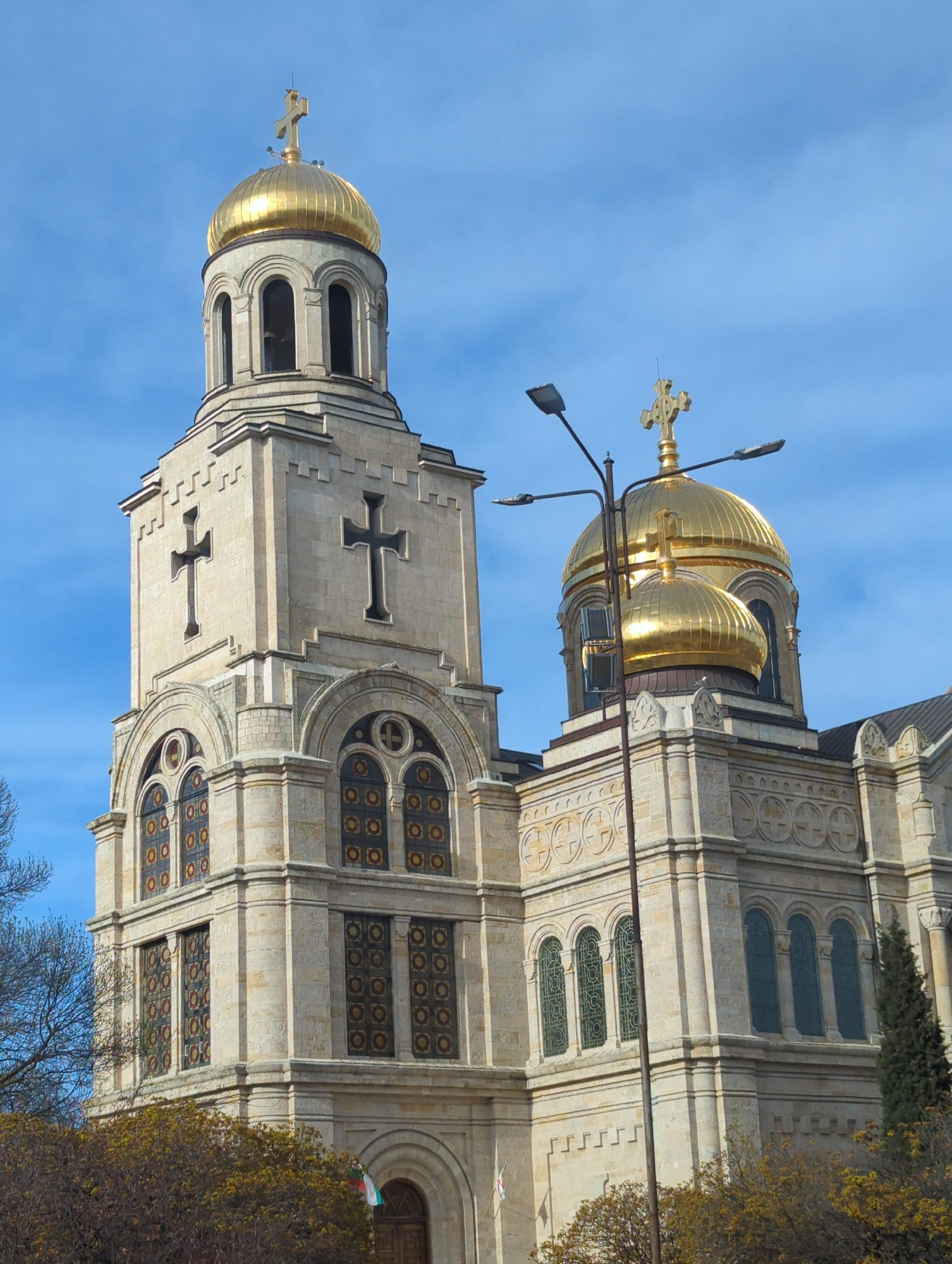The image captures the Assumption Cathedral in Varna, Bulgaria. It features two prominent structures: a bell tower with a golden dome and a larger cathedral building with a golden dome. Both structure…read more