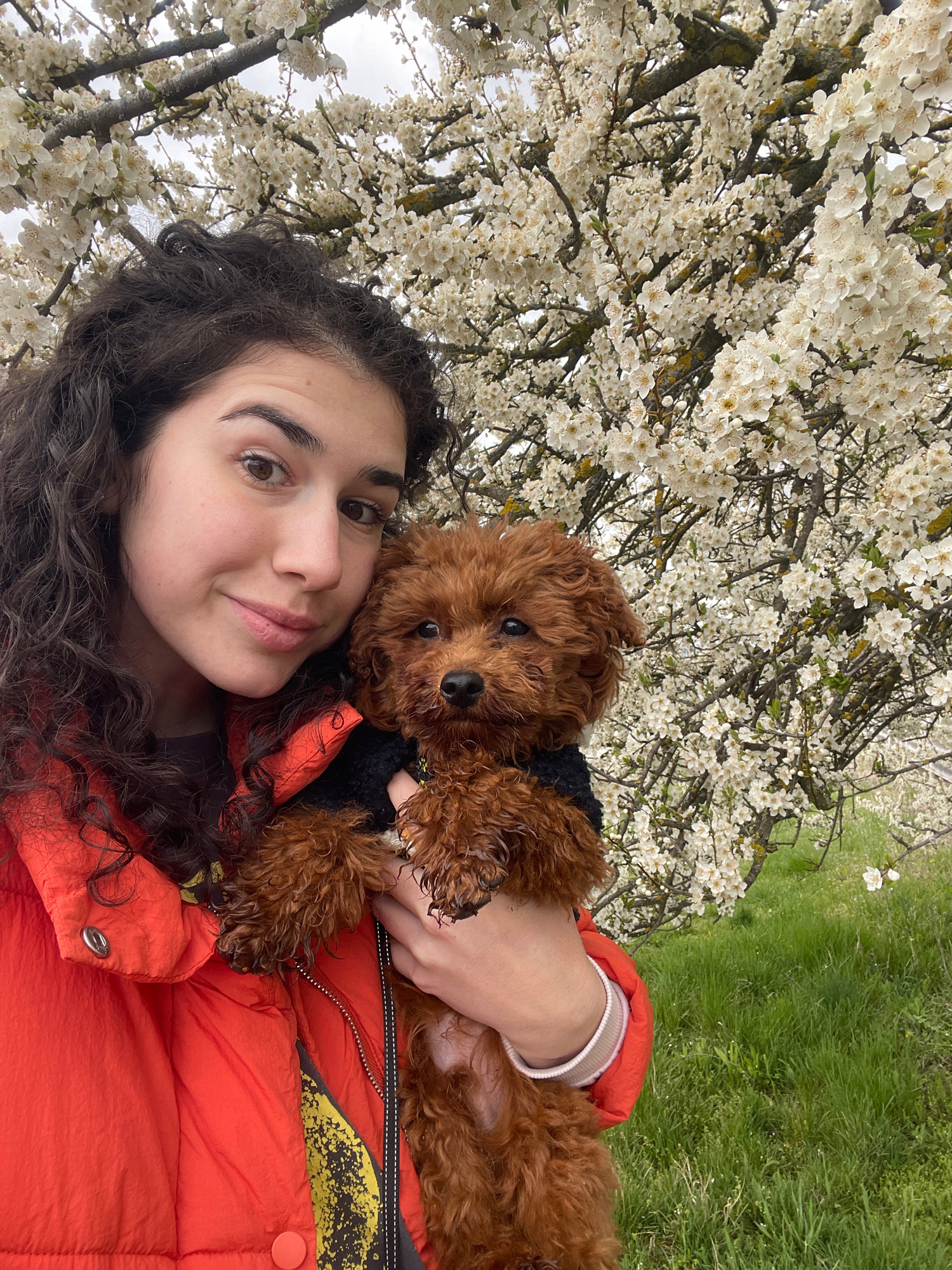 A young woman is holding a small, brown, curly-haired dog. They are positioned in front of a tree with dense white blossoms. The woman has dark, curly hair and is wearing an orange jacket. The dog is…read more