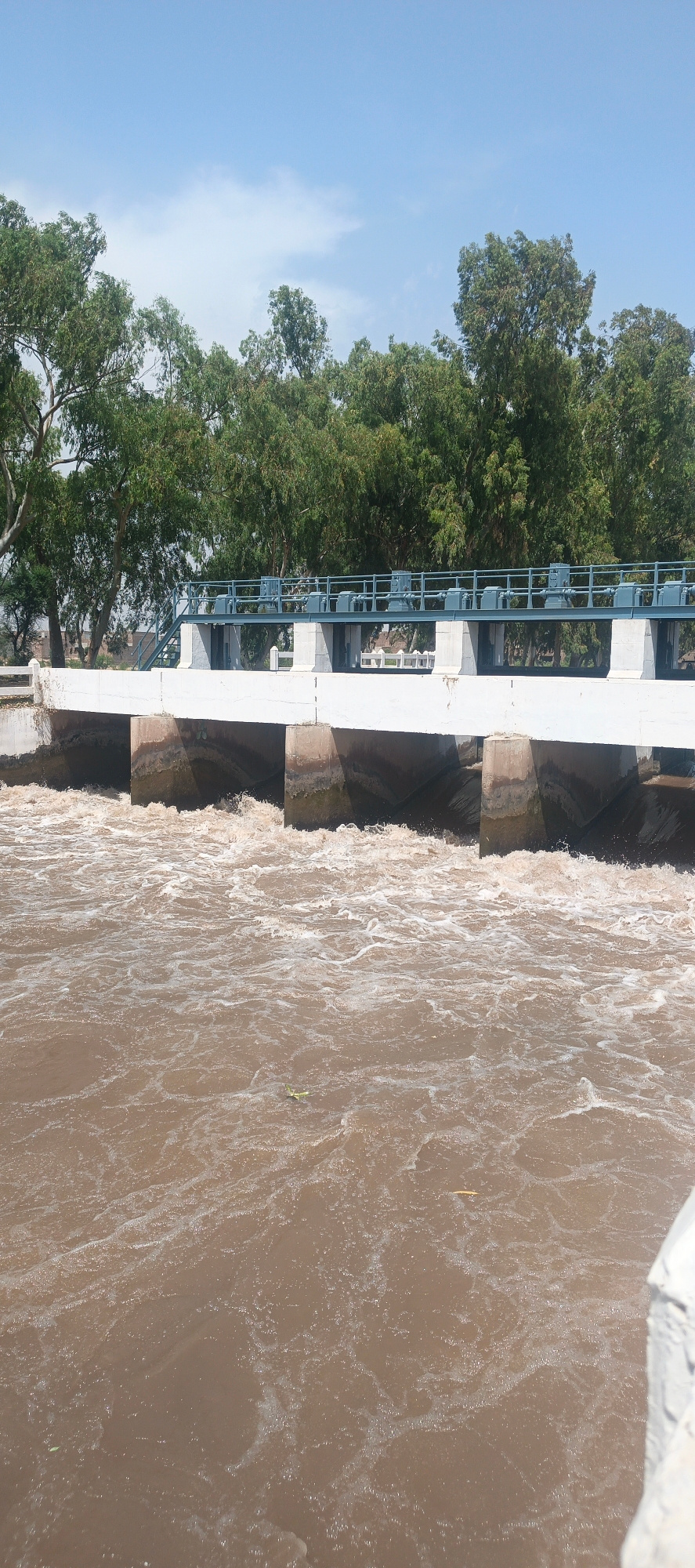 The image captures a concrete dam or barrage structure spanning a wide, brown, turbulent body of water under a clear blue sky. The dam features multiple sluice gates, which appear to be open, allowing…read more