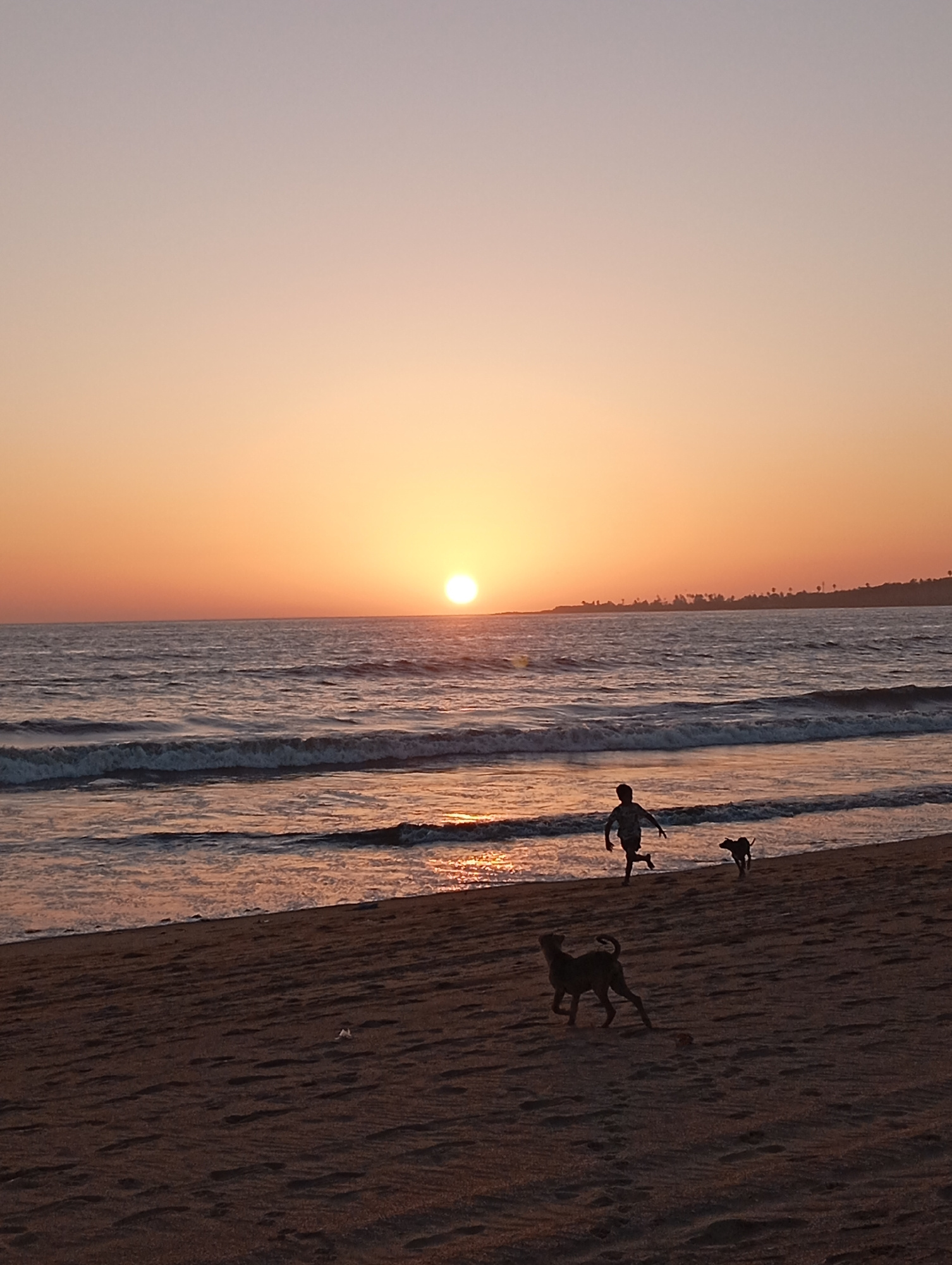 The image shows a beach scene at sunset. The sun is setting over the ocean in the background. A child and two dogs are on the beach in the foreground. The child is running along the shoreline, and the…read more