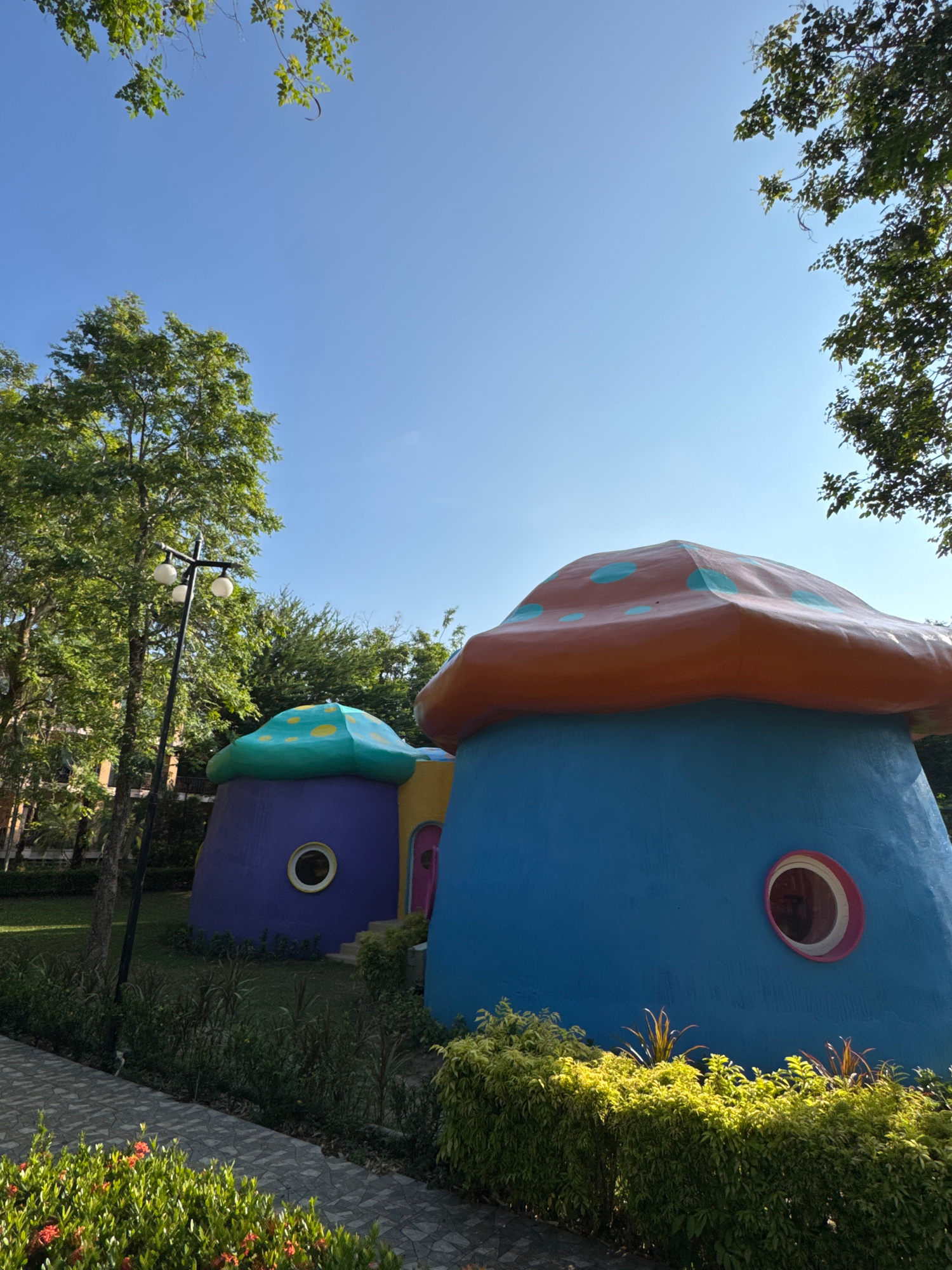 Here's a description of the image: The image features whimsically designed structures in a lush, outdoor setting. Two colorful, building-like shapes are prominent, resembling whimsical houses with ro…read more