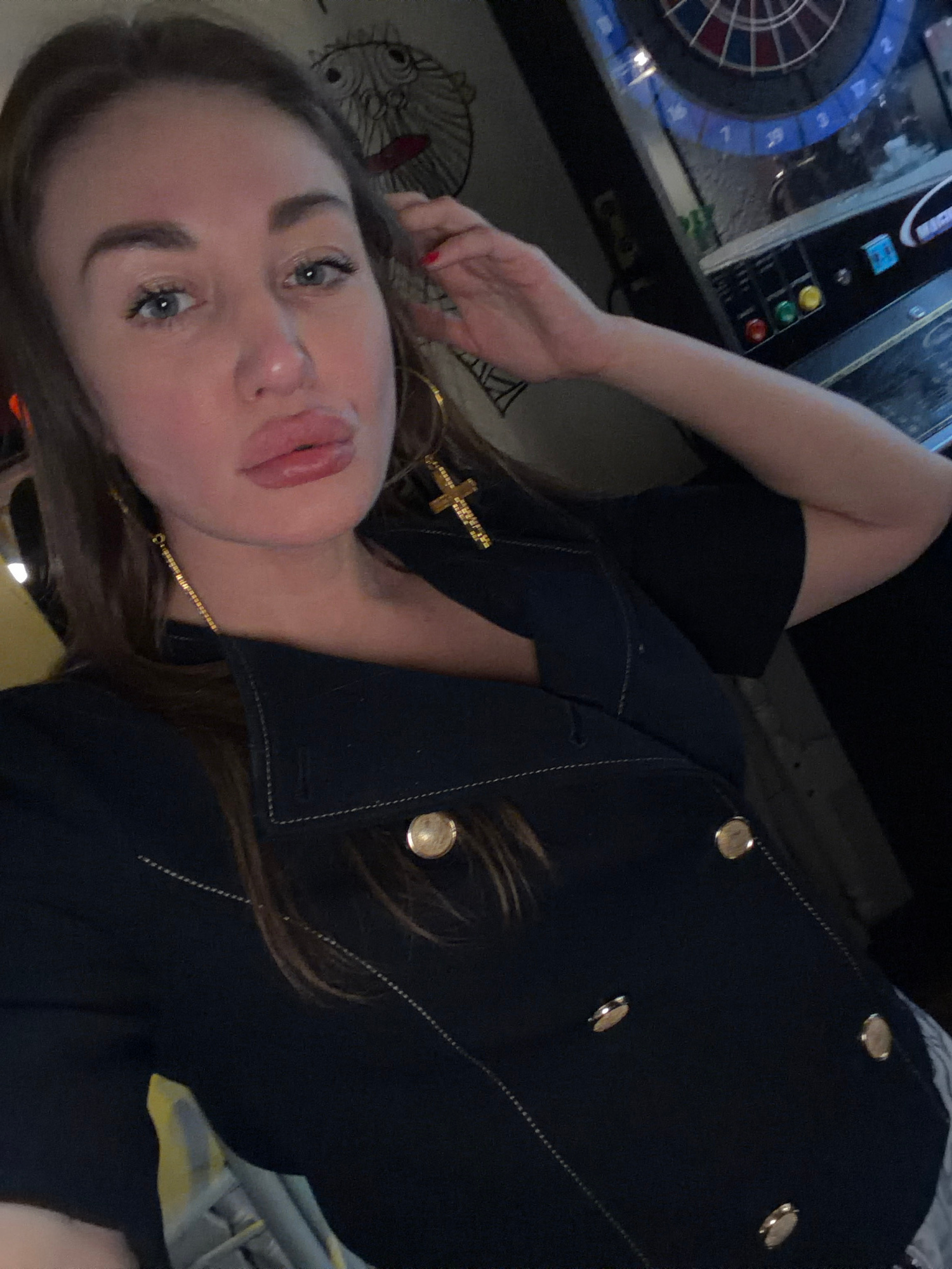 A woman is posing for a selfie. She has light skin, blue eyes, and brown hair. She's wearing a dark-colored jacket or top with gold buttons and a gold cross necklace. The background includes a dartboaβ¦read more